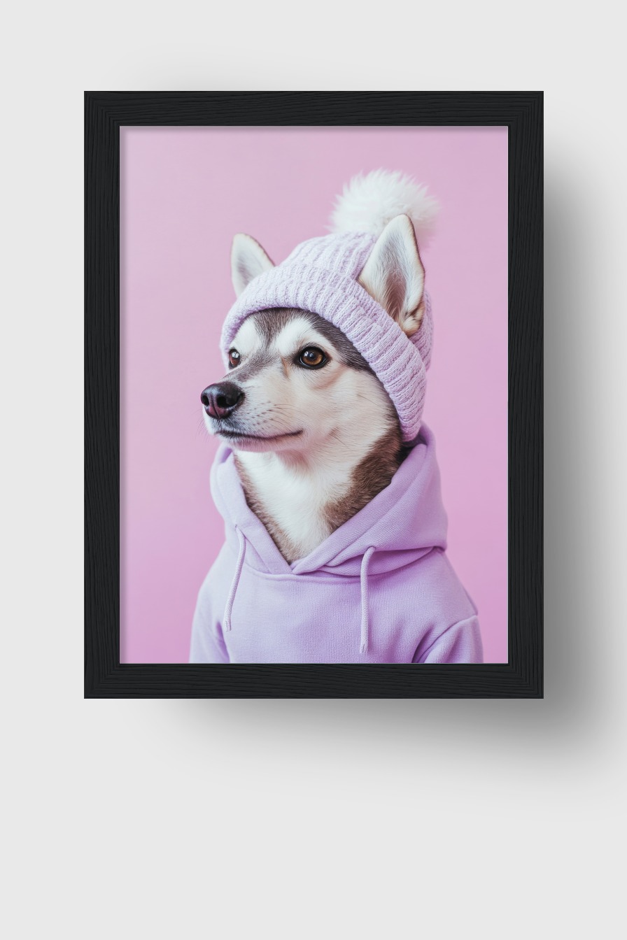 Poster mit Husky Hund in lila Bommelmütze und Hoodie vor rosa Hintergrund, modernes Tierporträt mit natürlicher Ausstrahlung
