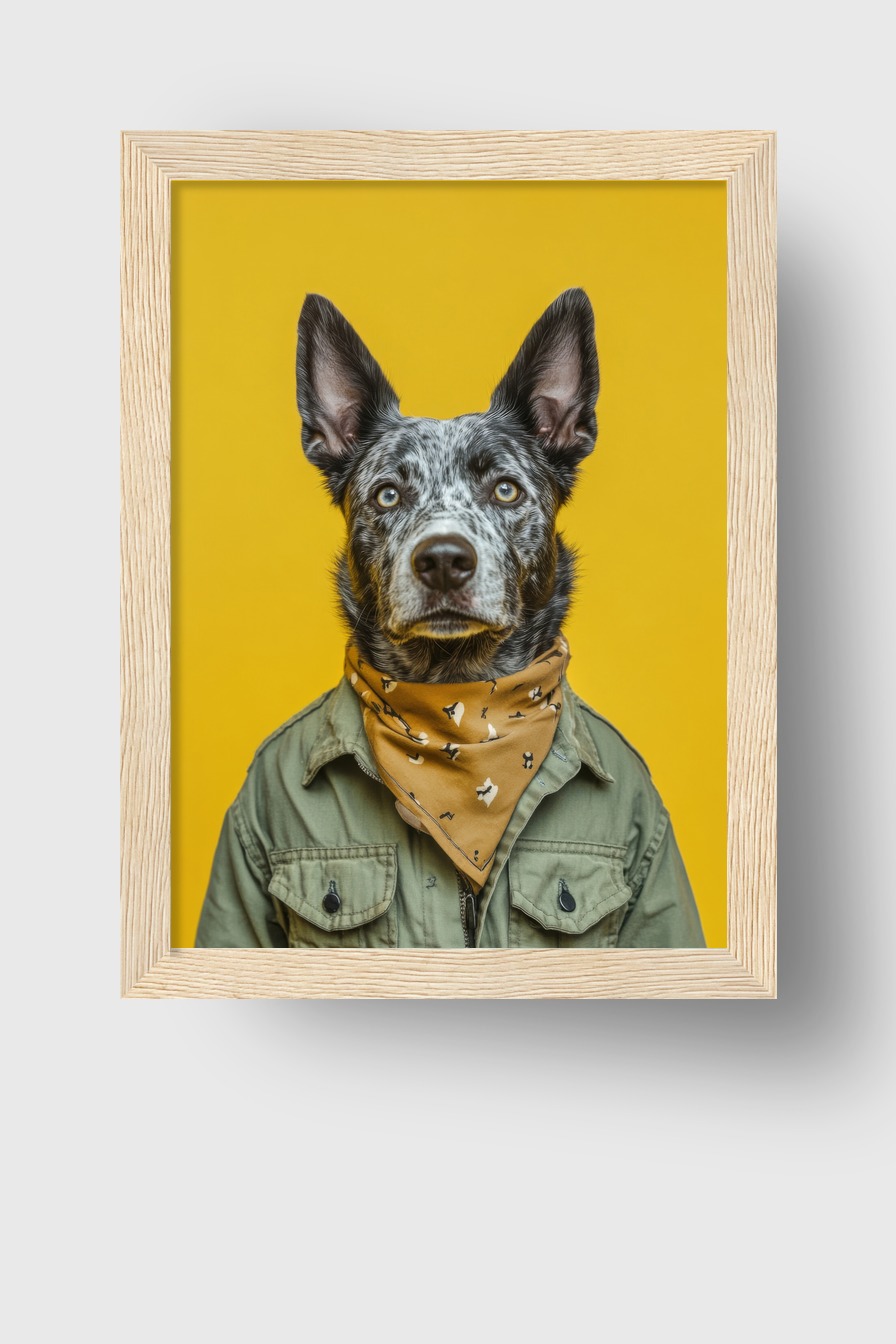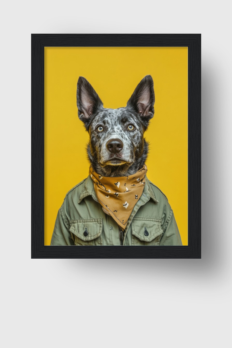 Poster mit Hundeporträt vor gelbem Hintergrund, dekorativer Kunstdruck mit Halstuch