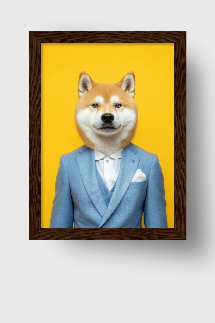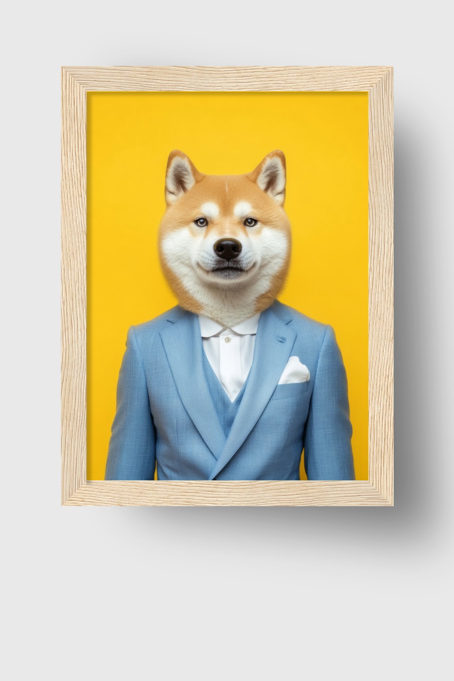 Ein Shiba Inu trägt einen hellblauen Anzug vor einem kräftigen gelben Hintergrund. Das Motiv kombiniert Tierportrait mit moderner Mode.
