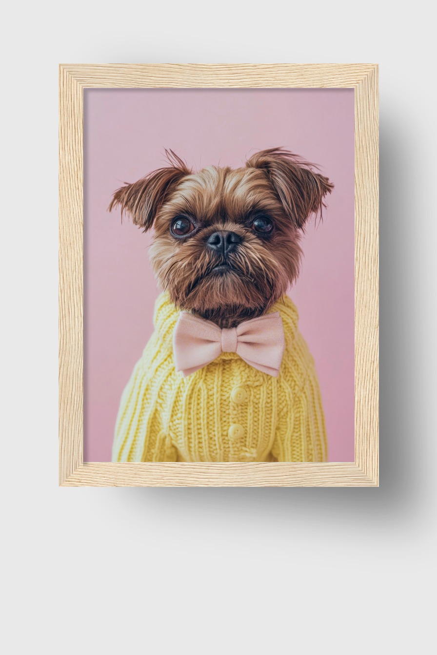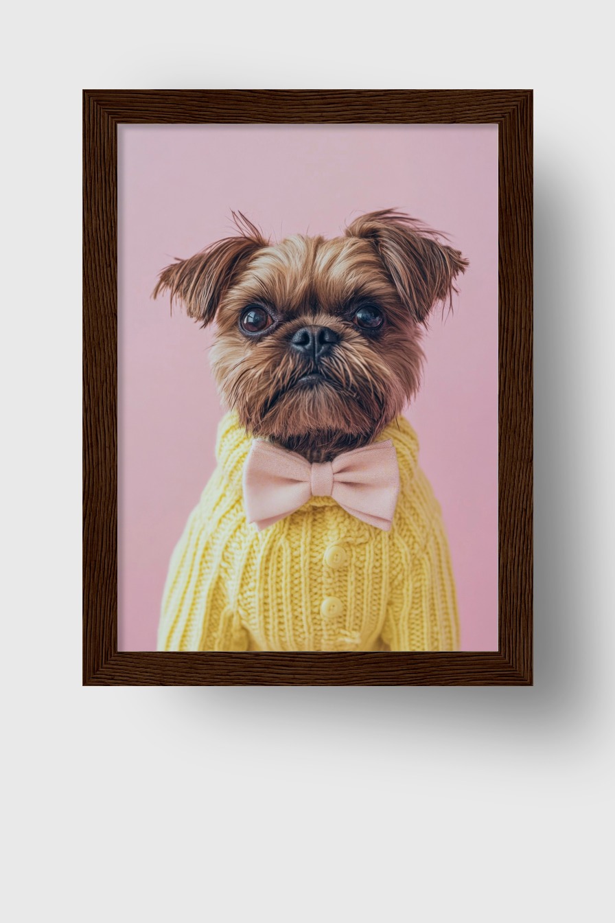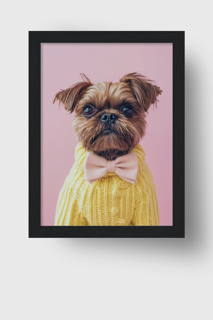 Ein kleiner Hund trägt einen gelben Strickpullover und eine rosa Fliege vor einem rosa Hintergrund. Das Bild zeigt ein charmantes und detailreiches Porträt des Hundes.