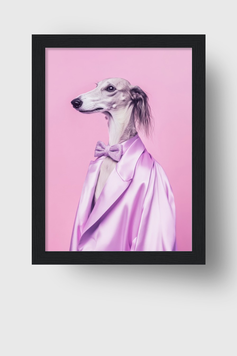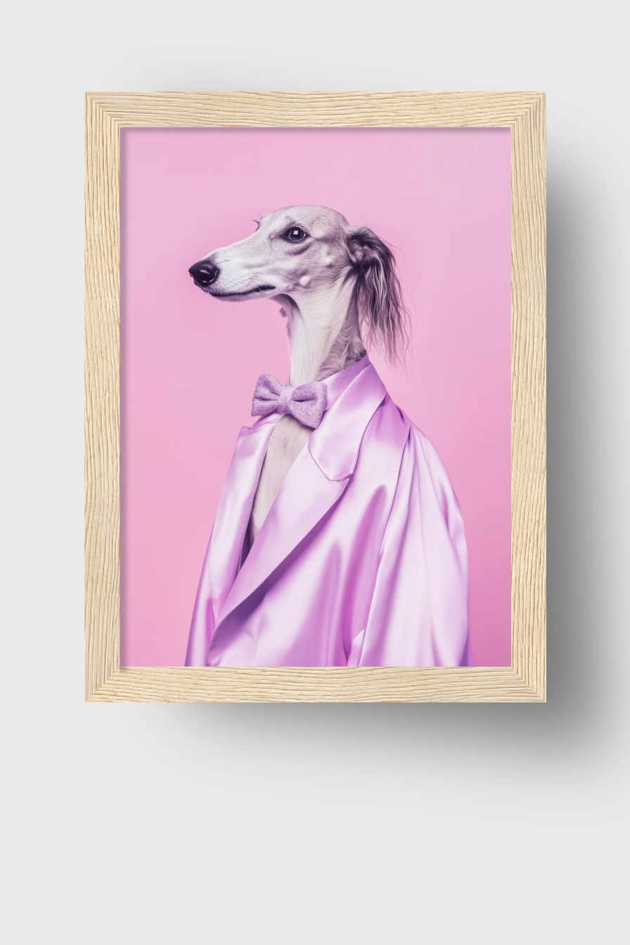 Poster mit Porträt eines Windhunds im lilafarbenen Satinanzug und Fliege vor rosa Hintergrund, moderner Hundekunst