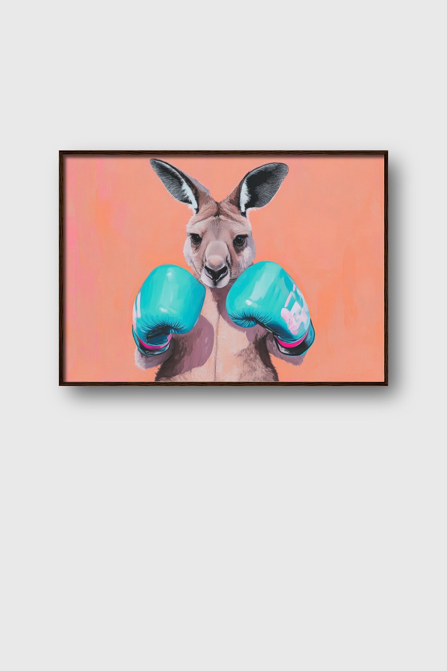 Das Bild zeigt ein Känguru mit kräftigen blauen Boxhandschuhen vor einem warmen orange-rosa Hintergrund. Die Darstellung ist detailreich und lebendig.