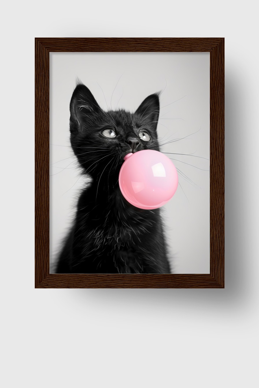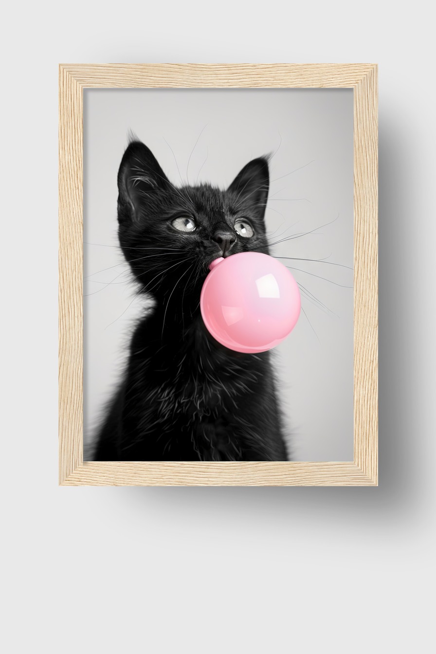 Schwarze Katze mit rosa Kaugummiblase auf halbmattem 170 g/m² FSC-Papier hinter bruchsicherem Plexiglas. Kiefernholzrahmen in Schwarz, Weiß, Natur oder Dunkelbraun. Fertig zum Aufhängen.