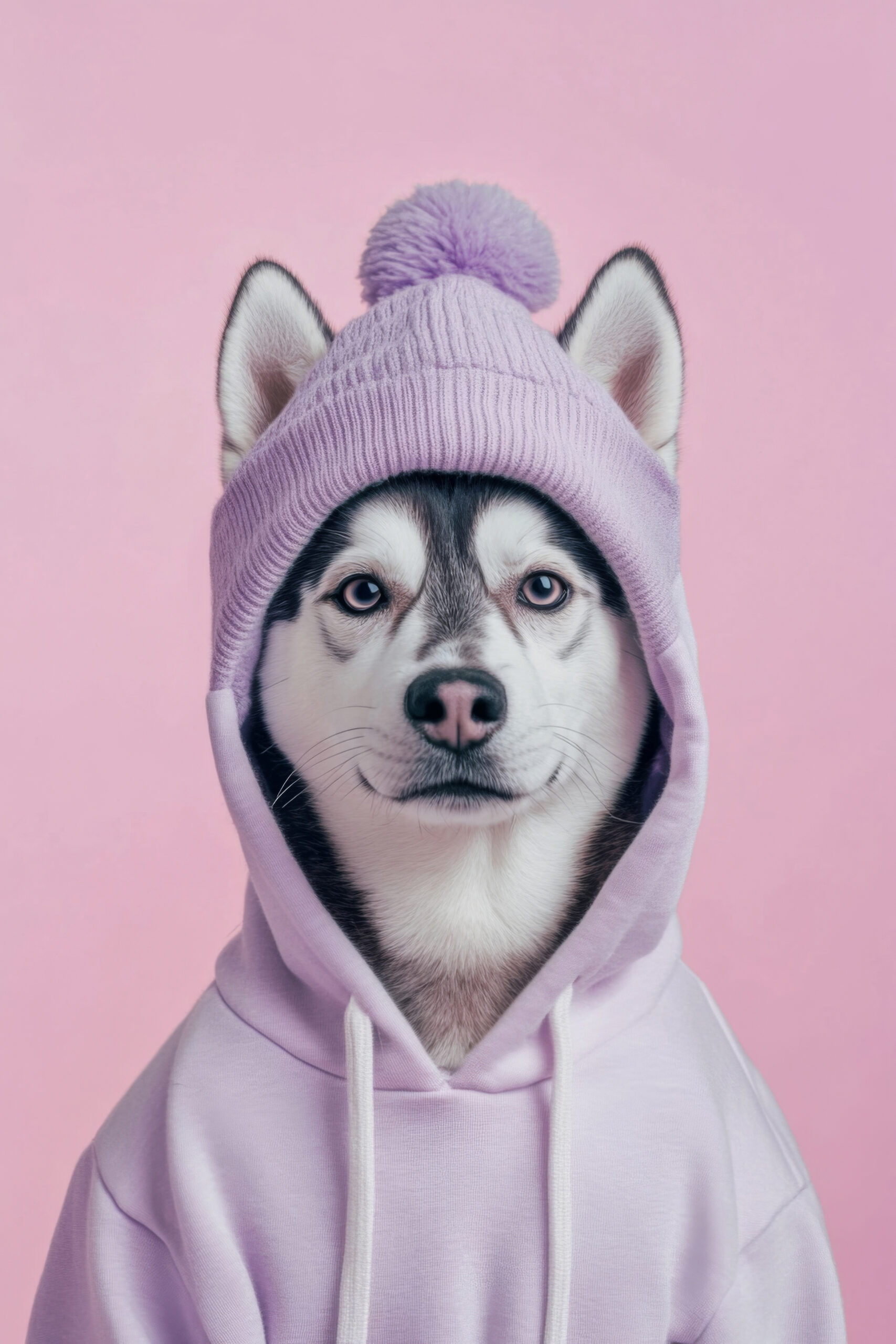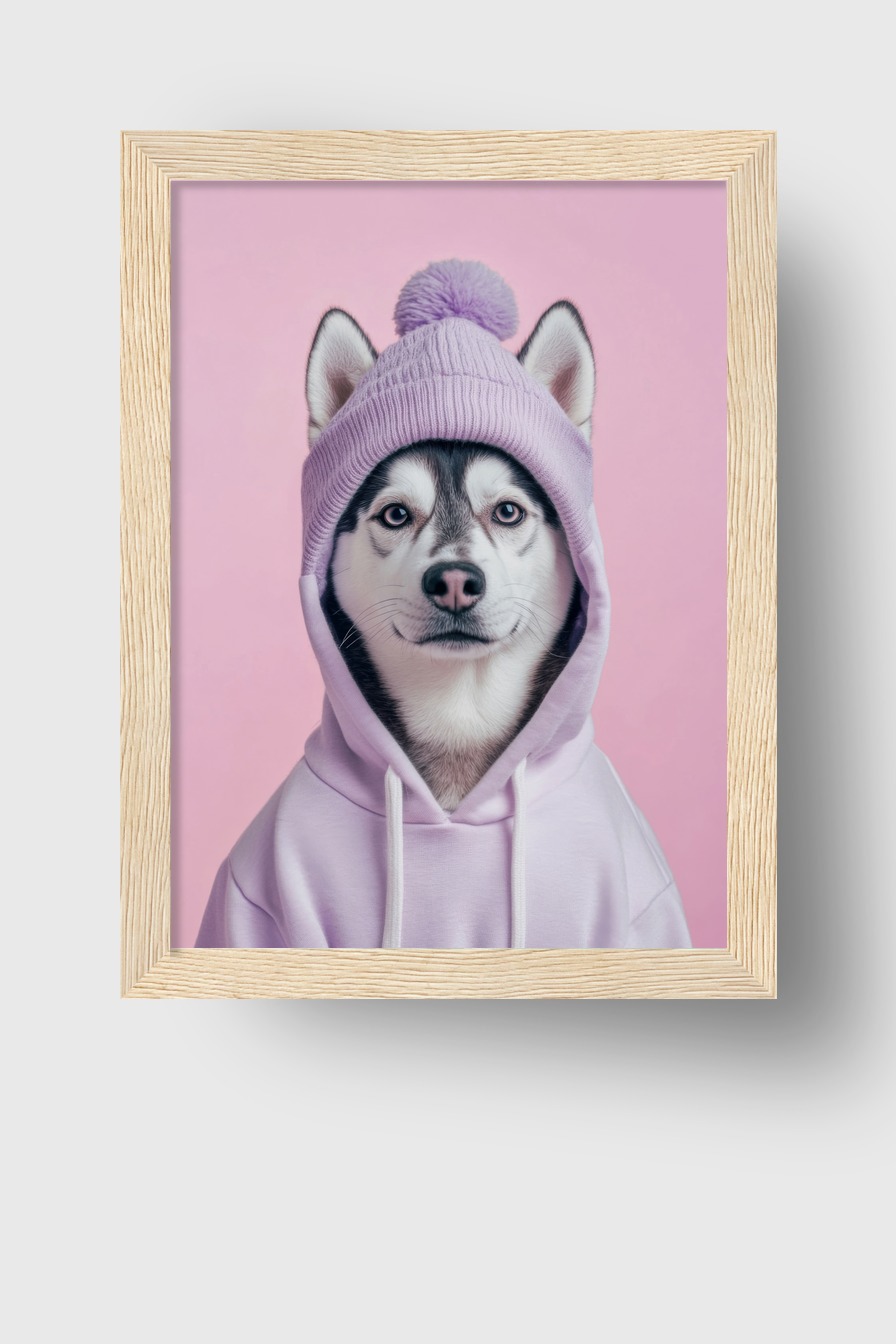 Poster mit Husky Hund im lila Kapuzenpullover vor rosa Hintergrund, moderner Tierportrait Kunstdruck