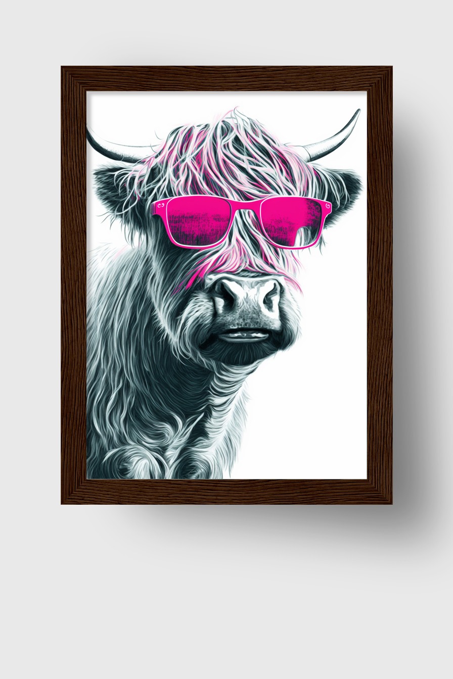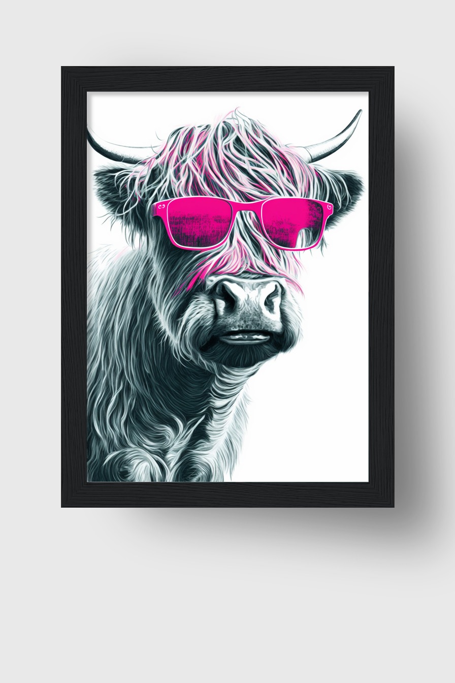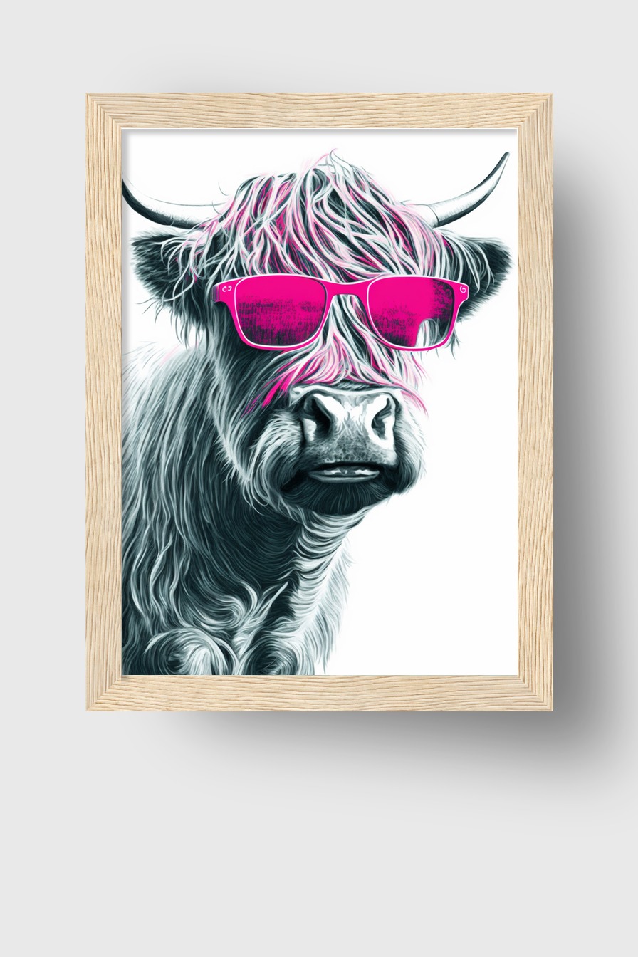 Poster des Highland Rinds mit pinker Brille auf 170 g/m² halbmatt mit bruchsicherem Plexiglas hinter einem FSC-zertifizierten Kiefernholzrahmen. Fertig zum Aufhängen und inklusive Aufhängeset.