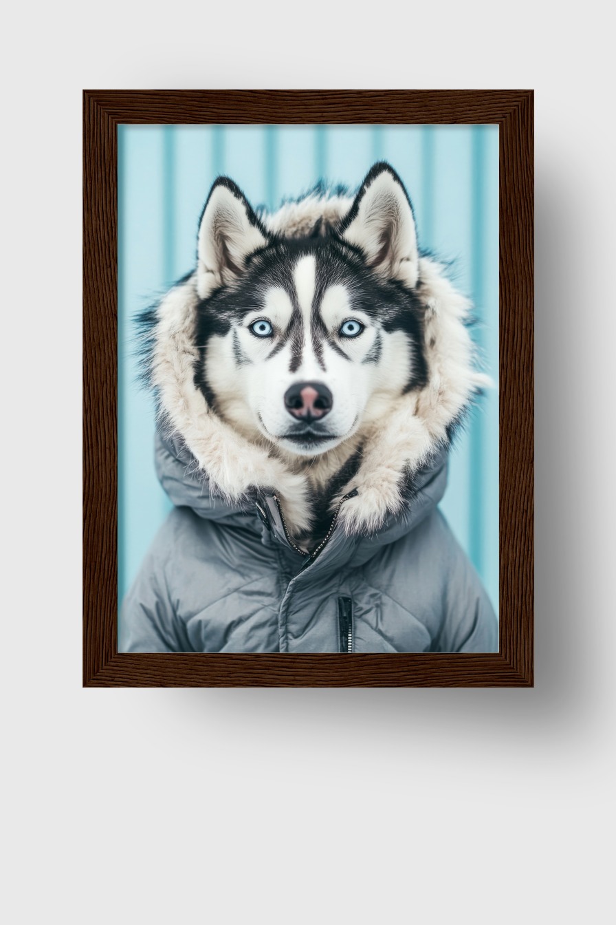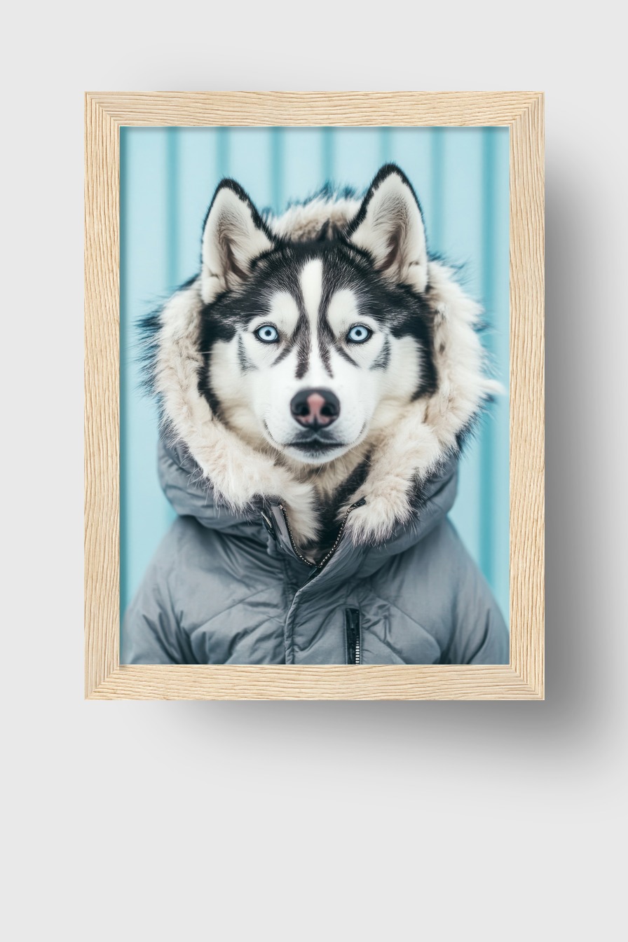 Poster mit einem Huskyhund im Parka, zentriert und vor blauem Hintergrund, klarer Fokus auf das Gesicht, naturgetreuer Tierporträt Kunstdruck