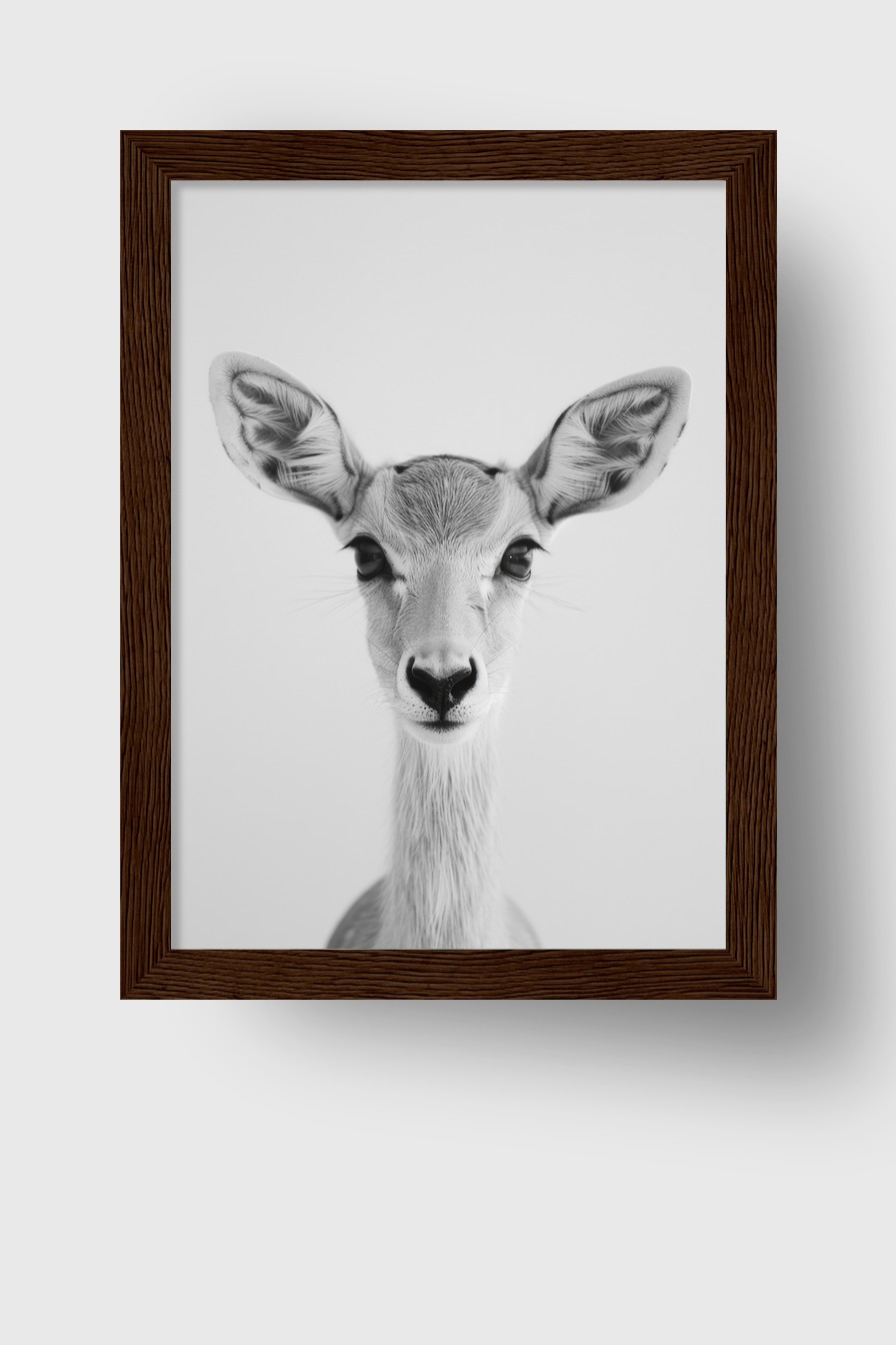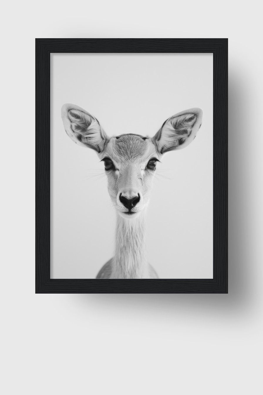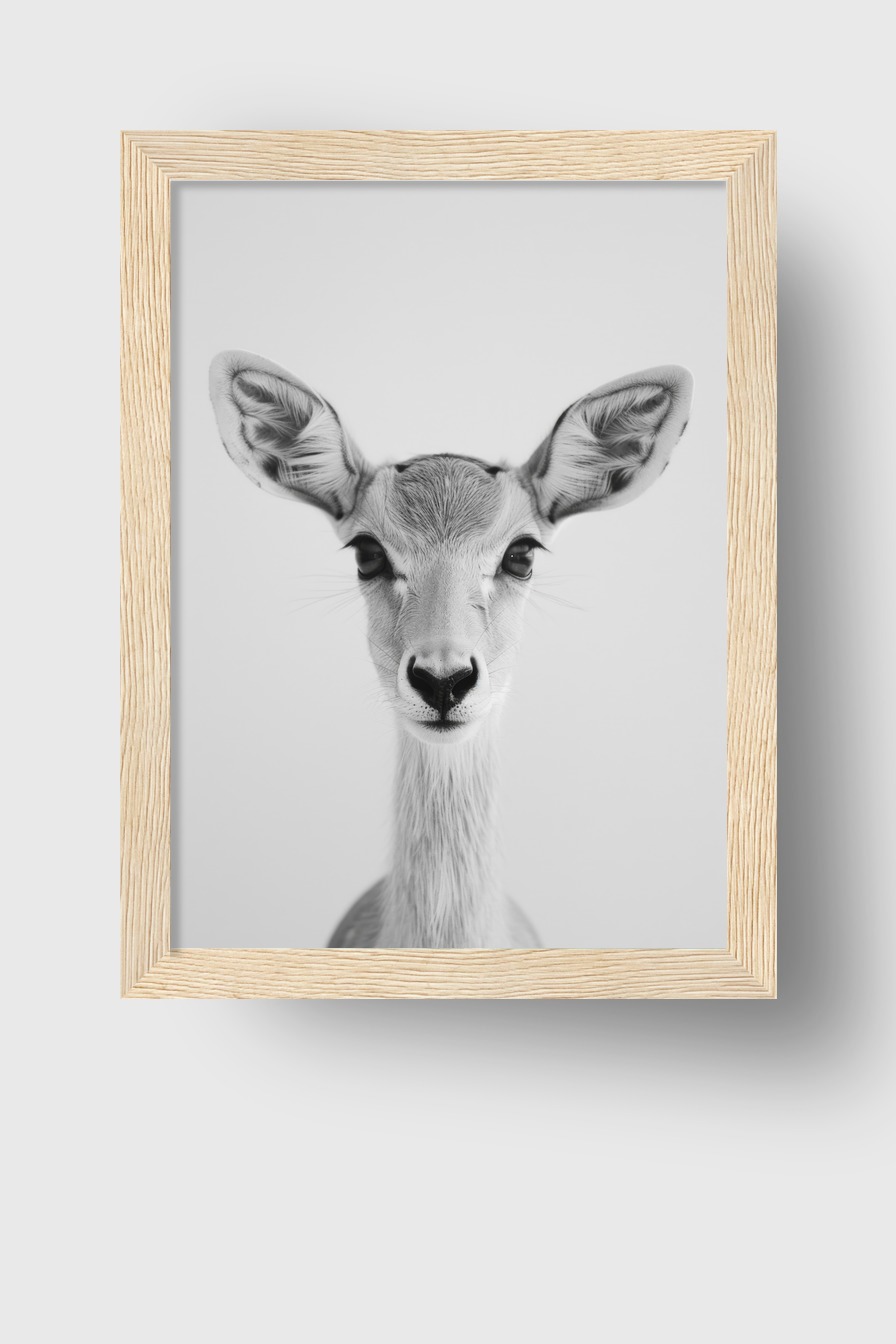 Das Bild zeigt das Gesicht einer jungen Antilope in schwarzweiß. Klare Details und große Ohren prägen die Aufnahme.