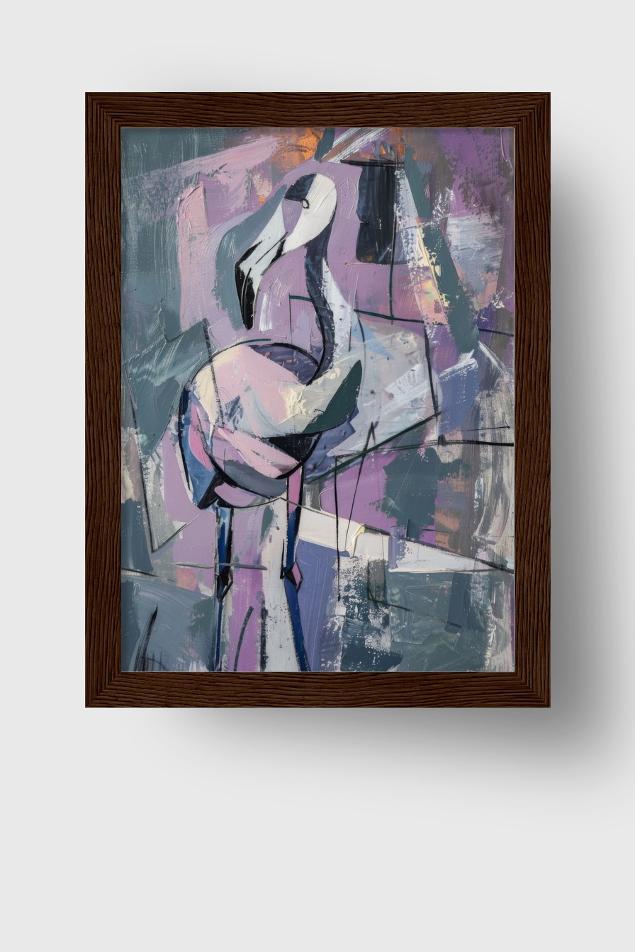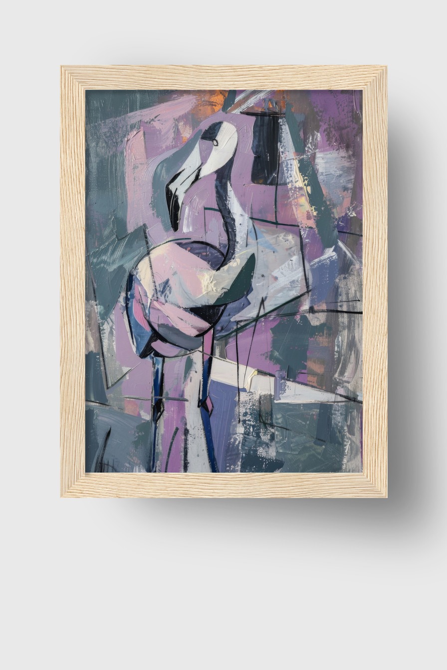 Prägnante Konturen eines Flamingos heben die langen Beine hervor, Farbflächen in Violett und Blau dominieren.