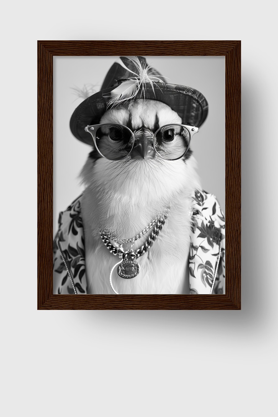 Poster eines Falken mit Hut auf 170 g/m² FSC-Papier, hinter bruchsicherem Plexiglas in Kiefernholzrahmen. Erhältlich in verschiedenen Farben, fertig zum Aufhängen.