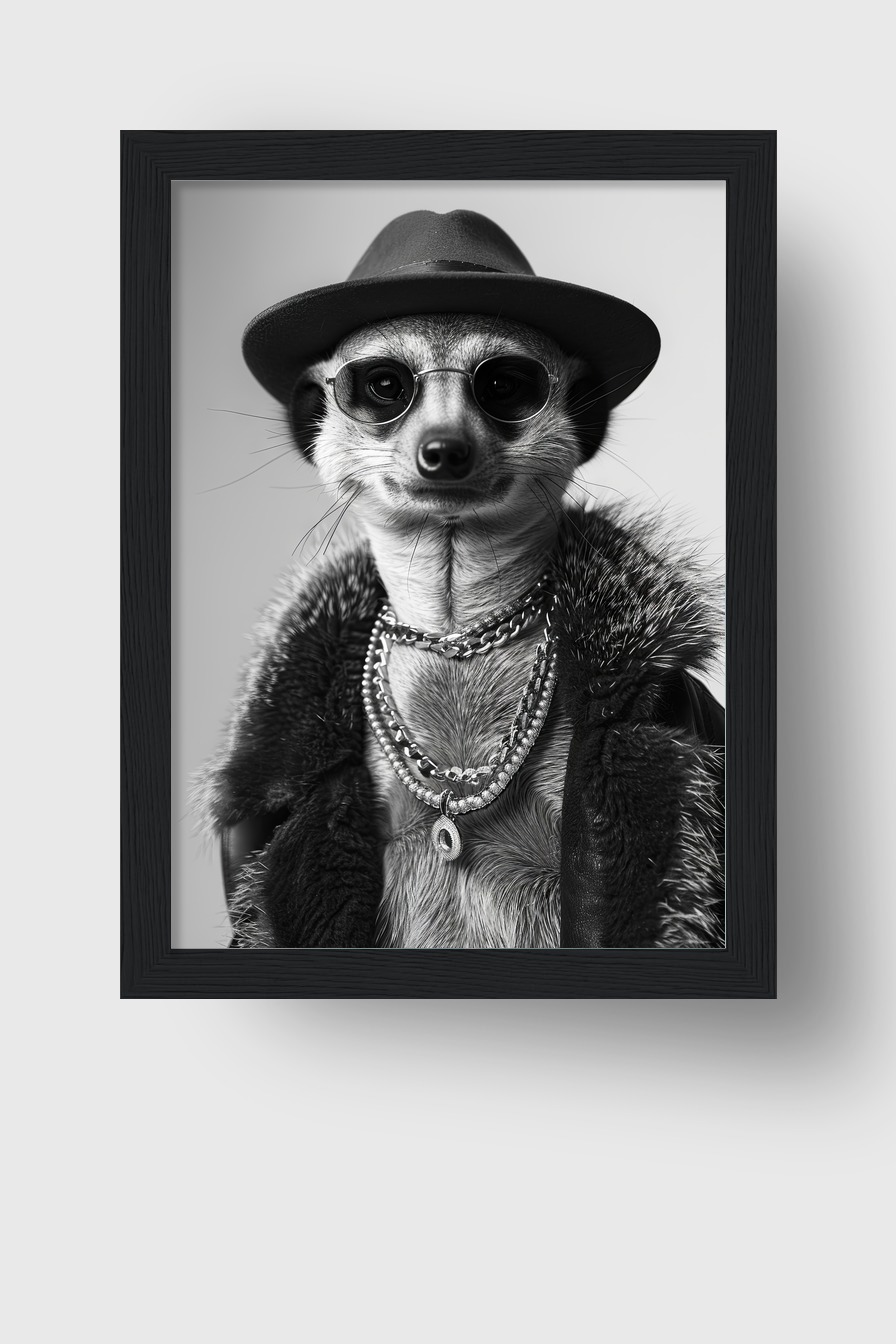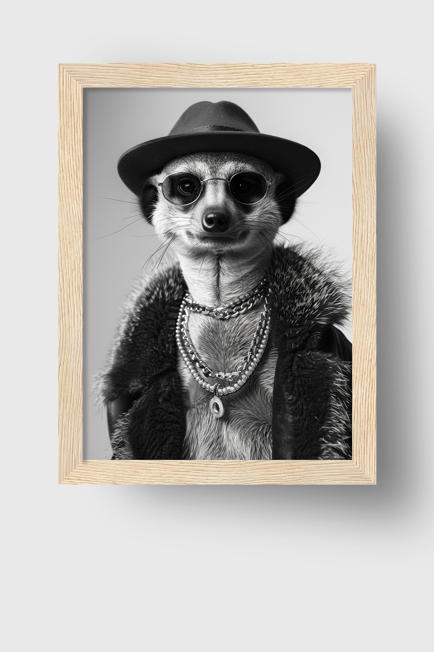 Ein Erdmännchen mit Hut, Sonnenbrille und Ketten. Als Poster 170 g/m² halbmatt hinter bruchsicherem Plexiglas in Kiefernholzrahmen (FSC). Erhältlich in Schwarz, Weiß, Naturholz oder Dunkelbraun. Fertig zum Aufhängen.