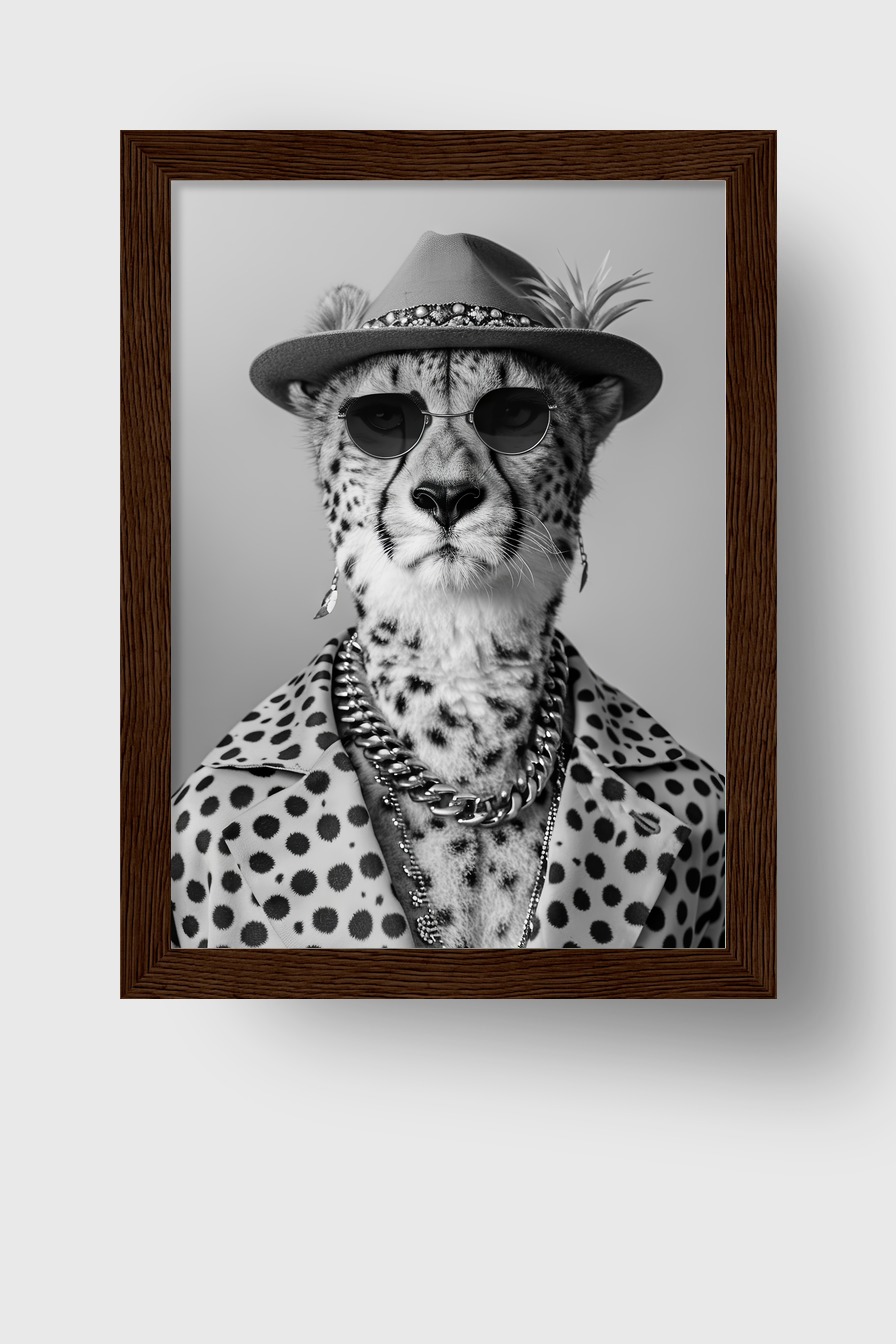 Poster (170 g/m², halbmatt) hinter bruchsicherem Plexiglas in einem Kiefernholzrahmen (FSC-zertifiziert). Gepard mit Hut und Sonnenbrille als Motiv. Erhältlich in Schwarz, Weiß, Naturholz und Dunkelbraun. Fertig zum Aufhängen, inklusive Aufhängeset.
