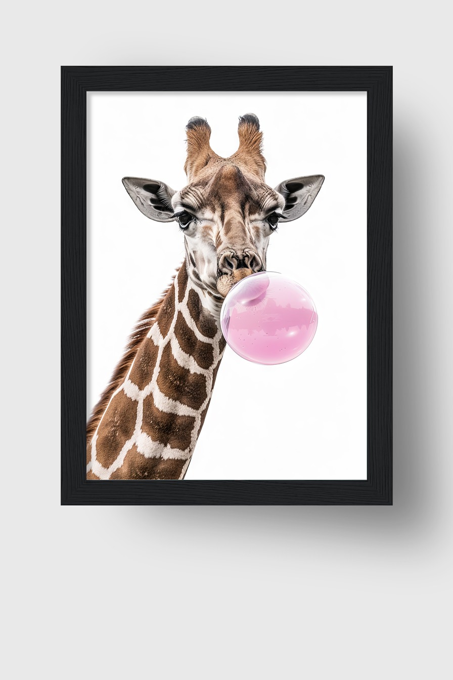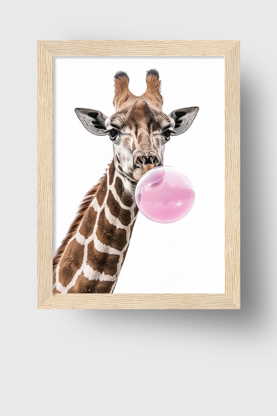 Detailreiches Giraffenportrait mit Kaugummiblase auf halbmattem 170 g/m² FSC-Papier hinter bruchsicherem Plexiglas. Gerahmt in Kiefernholz, erhältlich in Schwarz, Weiß, Naturholz und Dunkelbraun. Fertig zum Aufhängen.