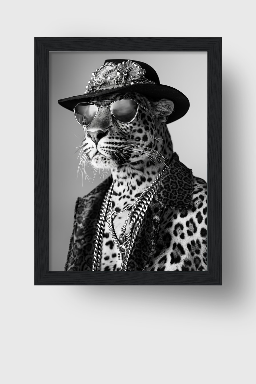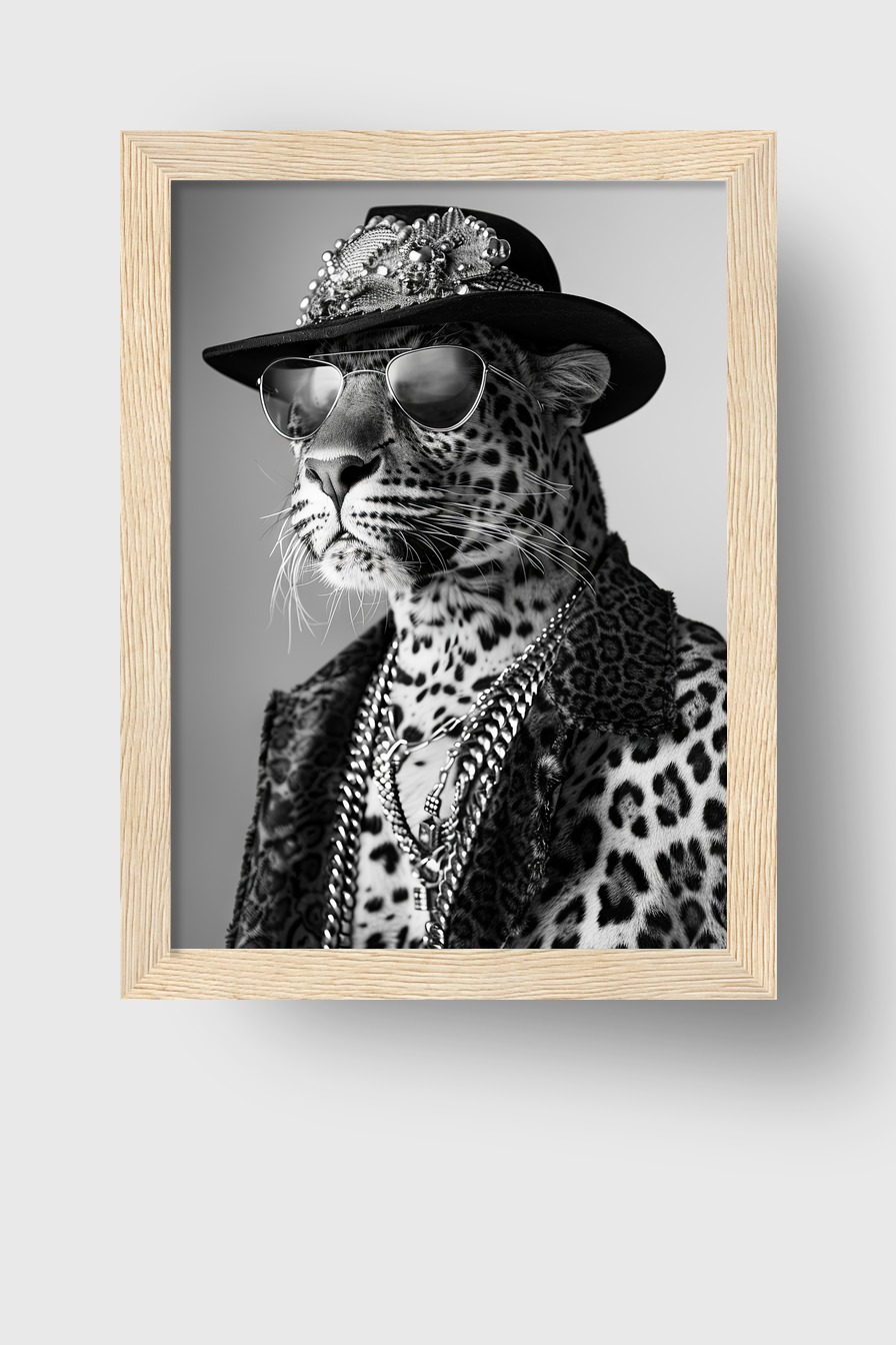 Schwarz-weißes Porträt eines Leoparden mit stilvollem Hut und Kette. Poster (170 g/m², halbmatt) hinter bruchsicherem Plexiglas in Kiefernholzrahmen (FSC-zertifiziert). In mehreren Rahmenfarben verfügbar, fertig zum Aufhängen.