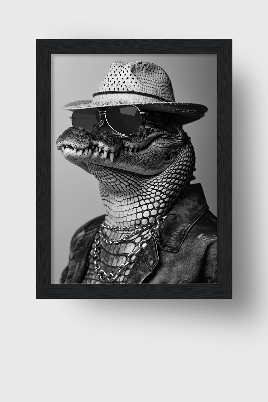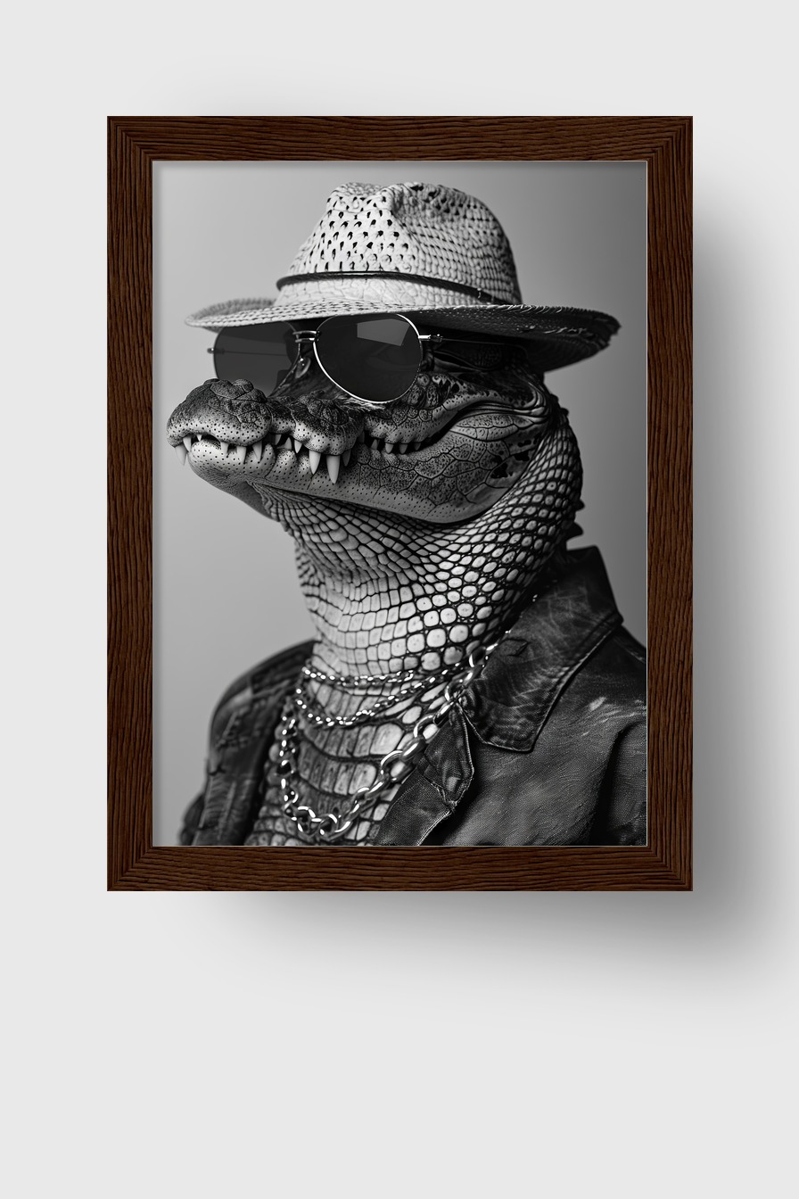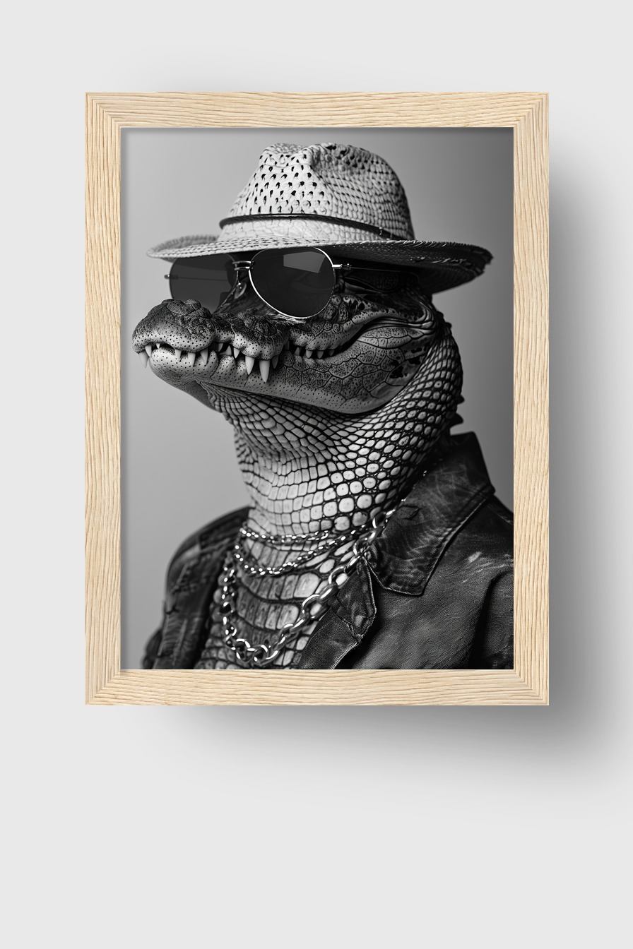 Poster (170 g/m², halbmatt) mit Alligator in Sonnenbrille hinter bruchsicherem Plexiglas in FSC-Kiefernholzrahmen. Erhältlich in Schwarz, Weiß, Naturholz und Dunkelbraun. Mit Aufhängeset.