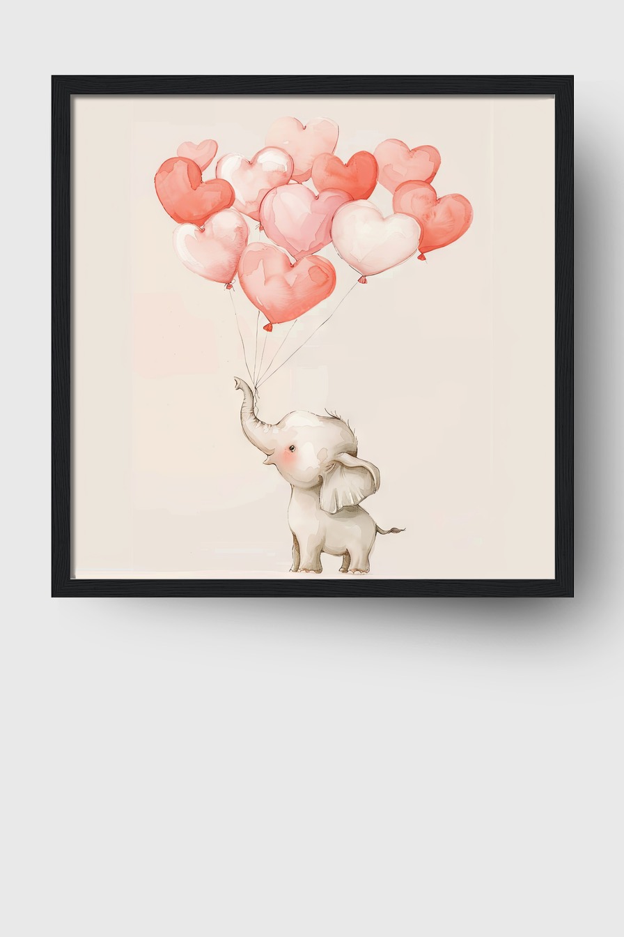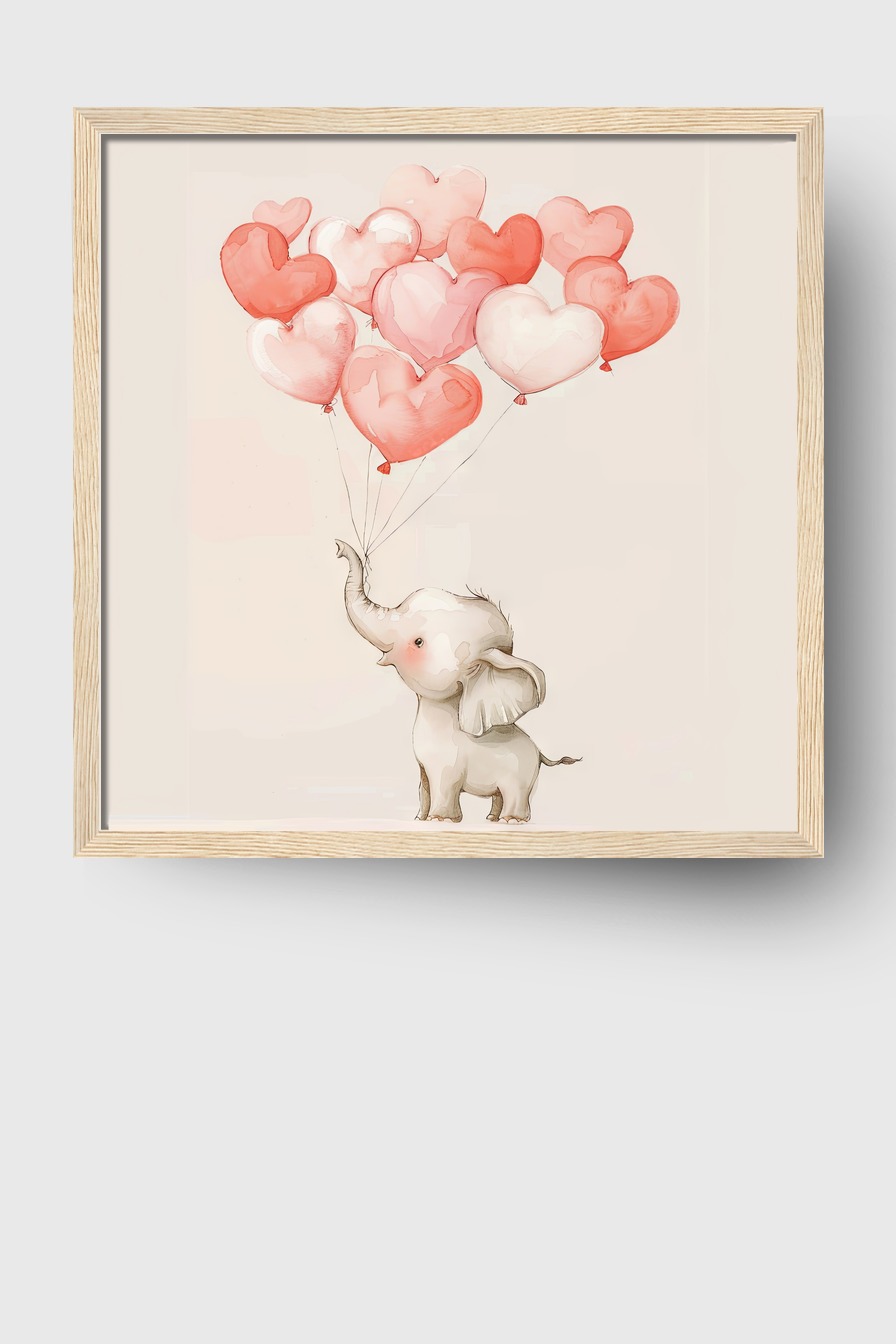 Der kleine Elefant mit den vielen schwebenden Herzballons verleiht dem Raum ein luftiges und beschwingtes Flair, ideal für helle, freundliche Räume mit sanften Farben.