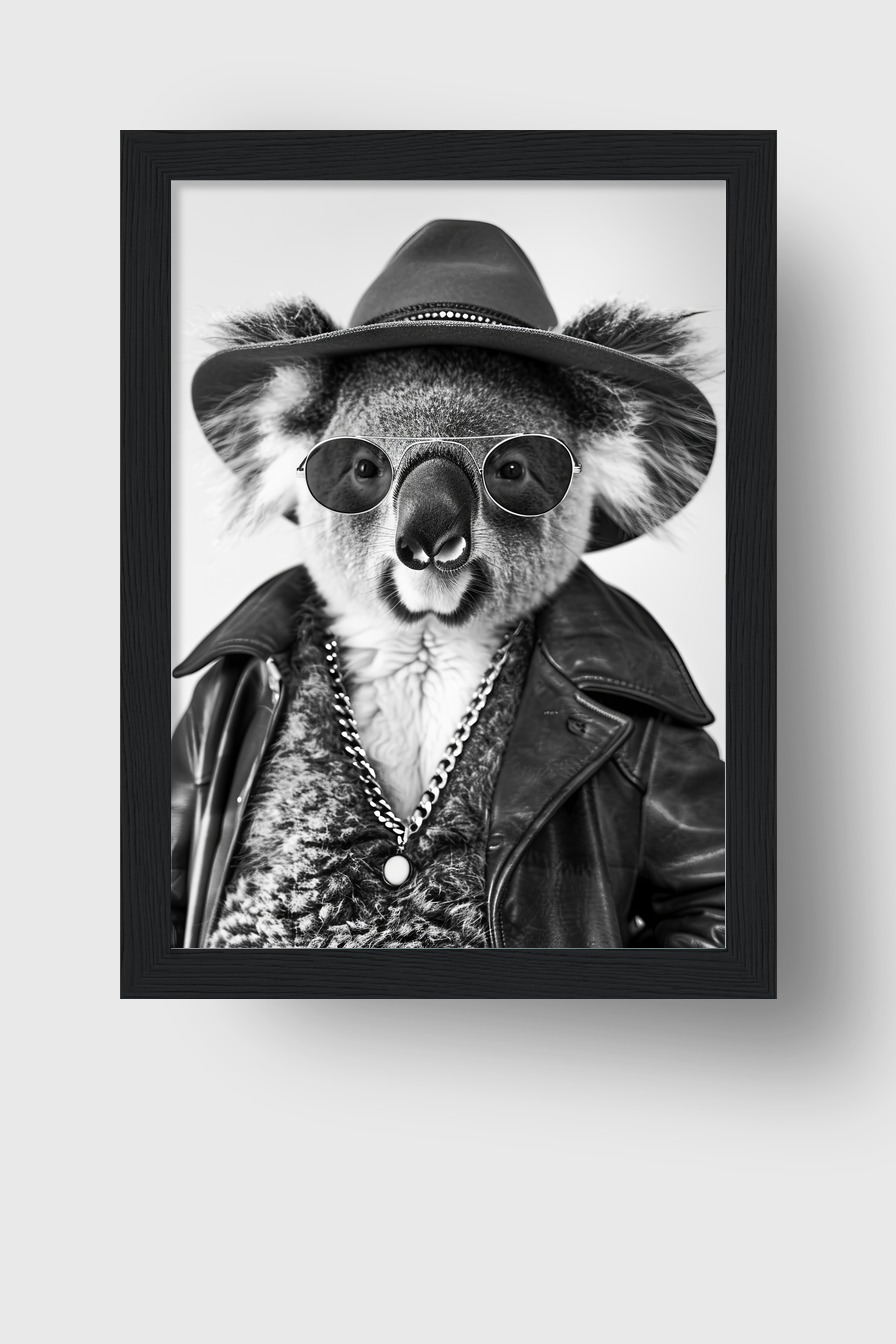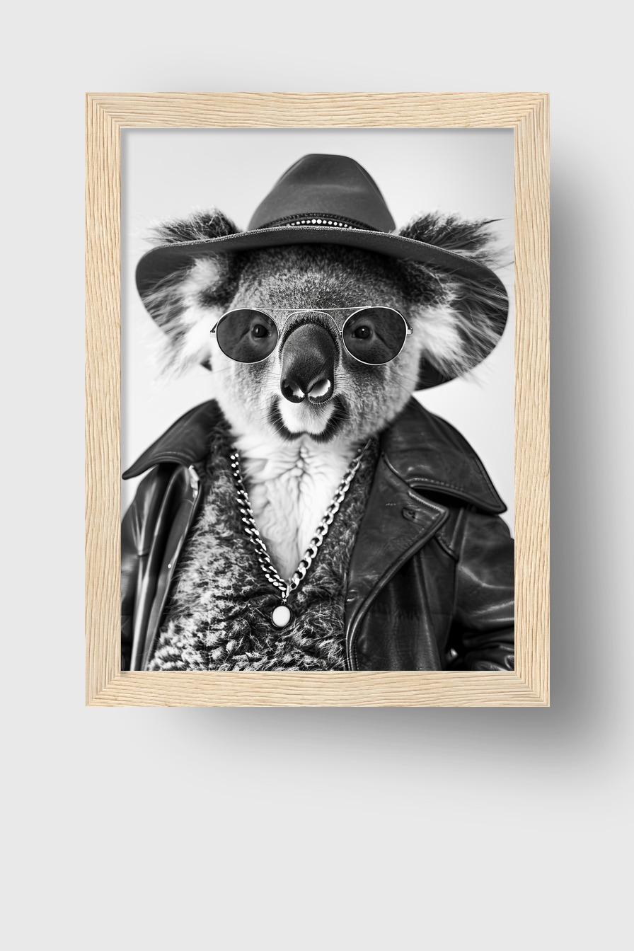 Schwarz-weißes Koala-Porträt mit Hut und Brille als Poster hinter bruchsicherem Plexiglas in Kiefernholzrahmen. Fertig zum Aufhängen.