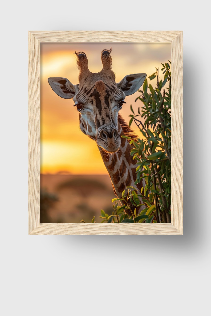 Detailliertes Giraffenportrait vor Sonnenuntergang auf Posterpapier (170 g/m²) hinter bruchsicherem Plexiglas in Kiefernholzrahmen (FSC-zertifiziert). Komplett mit Aufhängeset.