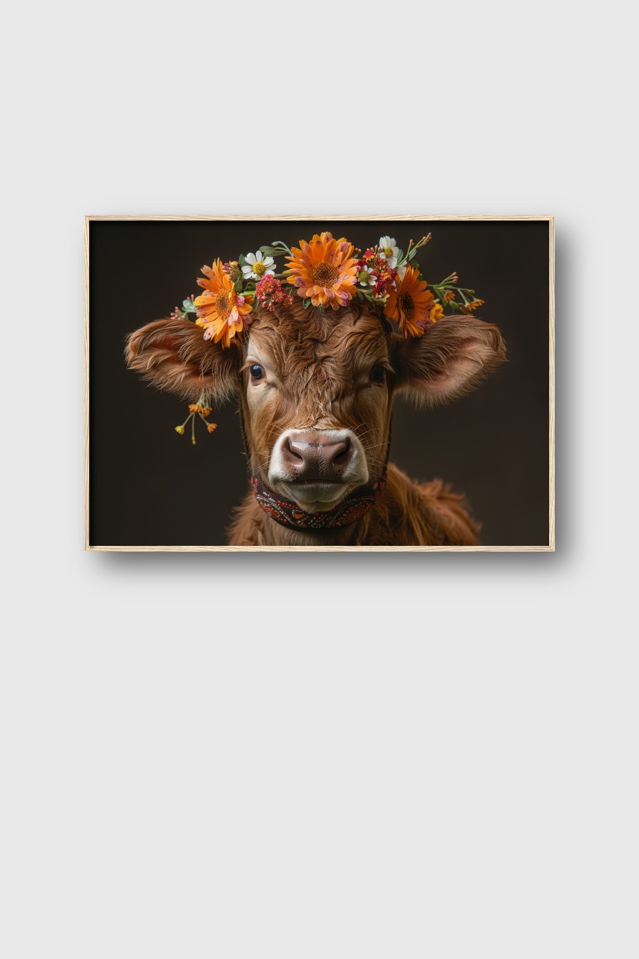 Portrait eines jungen Rinds mit Blumenkranz. Poster (170 g/m², halbmatt) hinter bruchsicherem Plexiglas in FSC-zertifiziertem Kiefernholzrahmen. Fertig zum Aufhängen mit Aufhängeset.