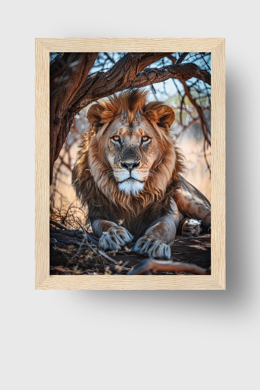 Löwe vor Baumzweigen, gedruckt auf halbmattes 170 g/m² Papier hinter bruchsicherem Plexiglas. Rahmen aus FSC-zertifiziertem Kiefernholz in verschiedenen Farben erhältlich. Fertig zum Aufhängen.