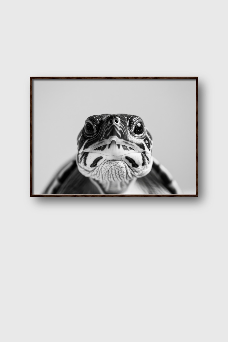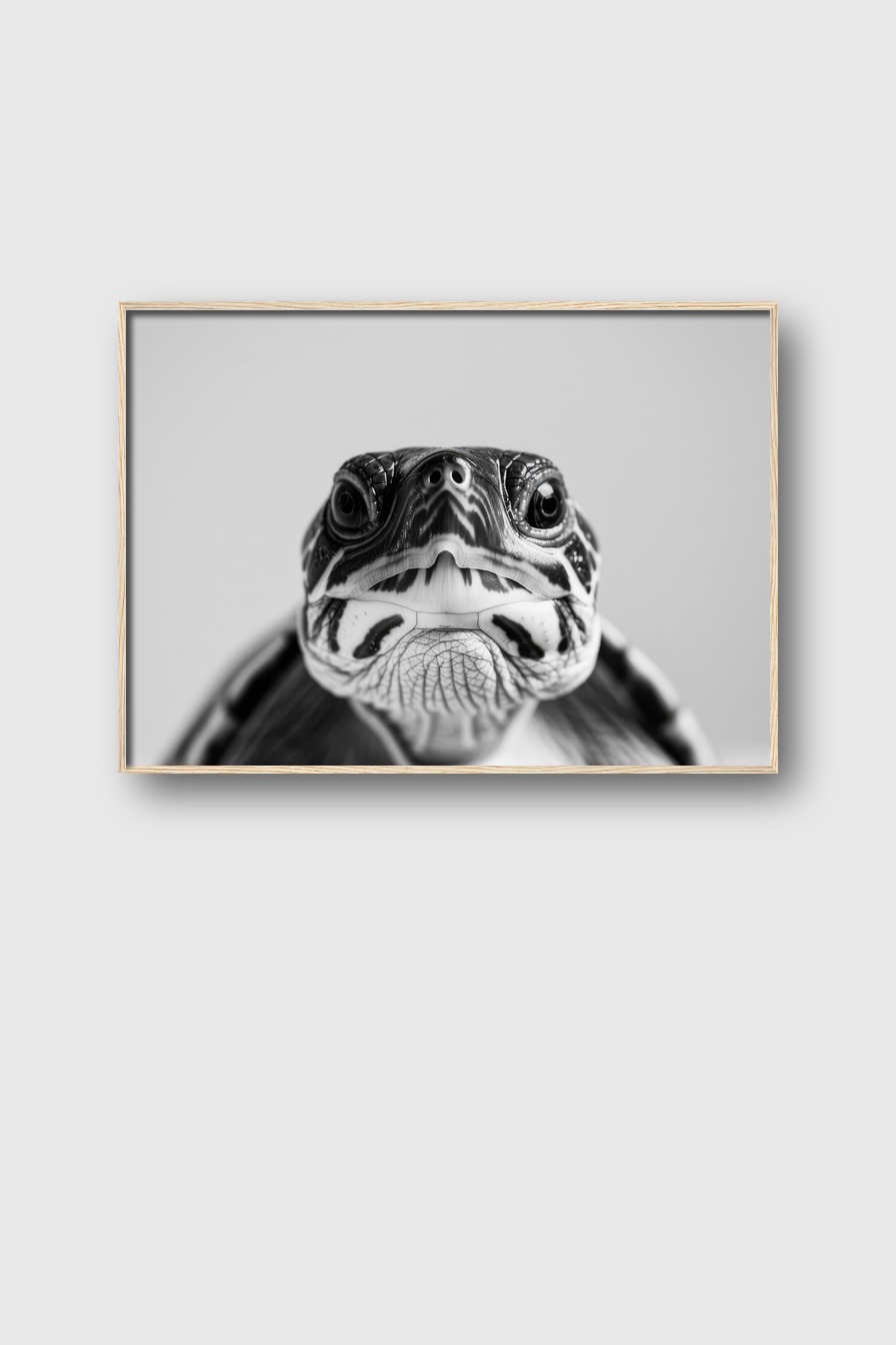 Direkt und unverfälscht tritt der Blick der Schildkröte hervor und füllt den Raum mit einer greifbaren Präsenz. Minimalistisch und markant wird sie zum Blickfang.