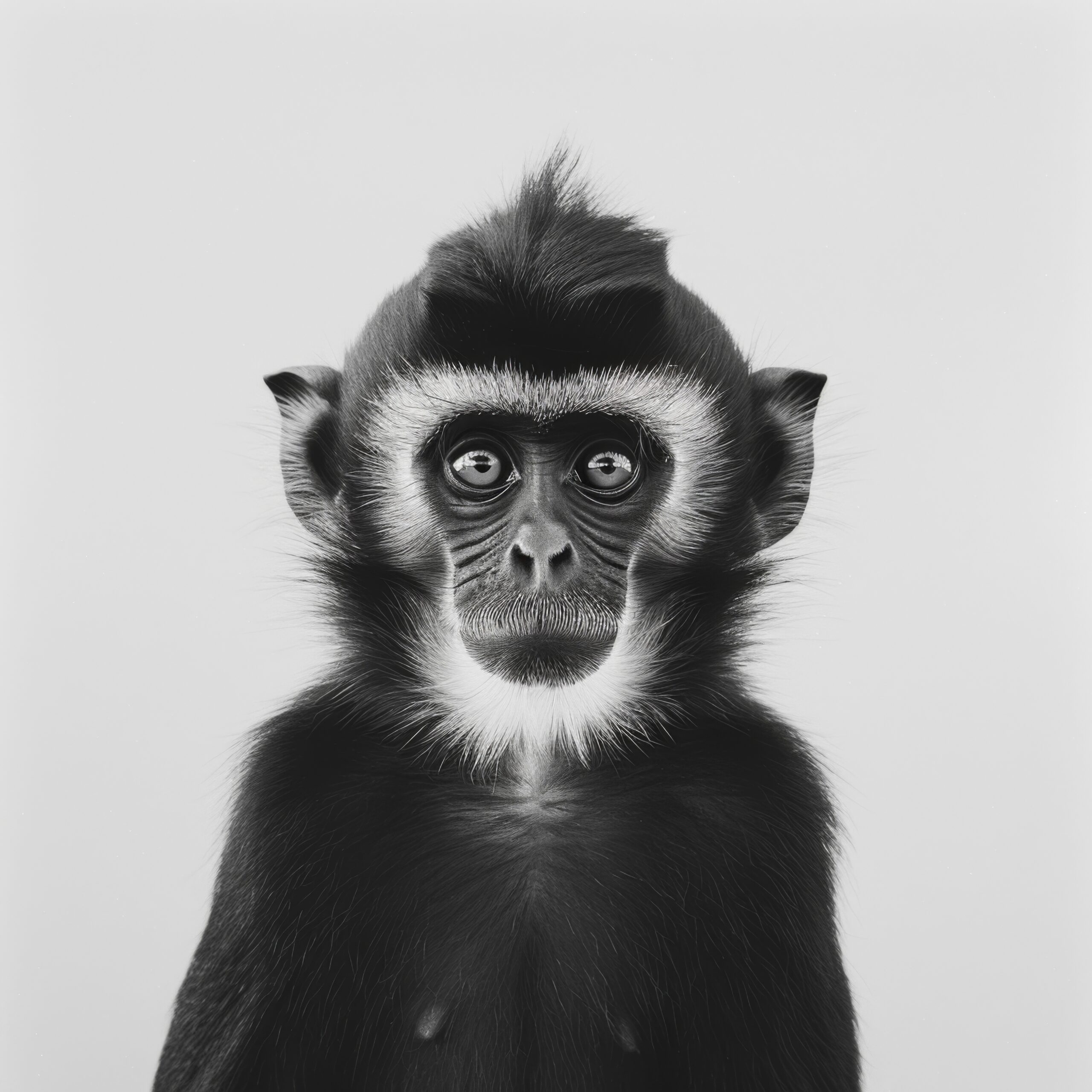 Das Bild präsentiert den Schimpansen in ruhiger Pose, wobei seine Gesichtszüge klar und detailliert hervortreten. Die monochrome Farbgebung hebt die natürlichen Kontraste hervor und unterstreicht die Tiefe des Motivs. Ein stiller Moment voller Präsenz und Ausdruck.