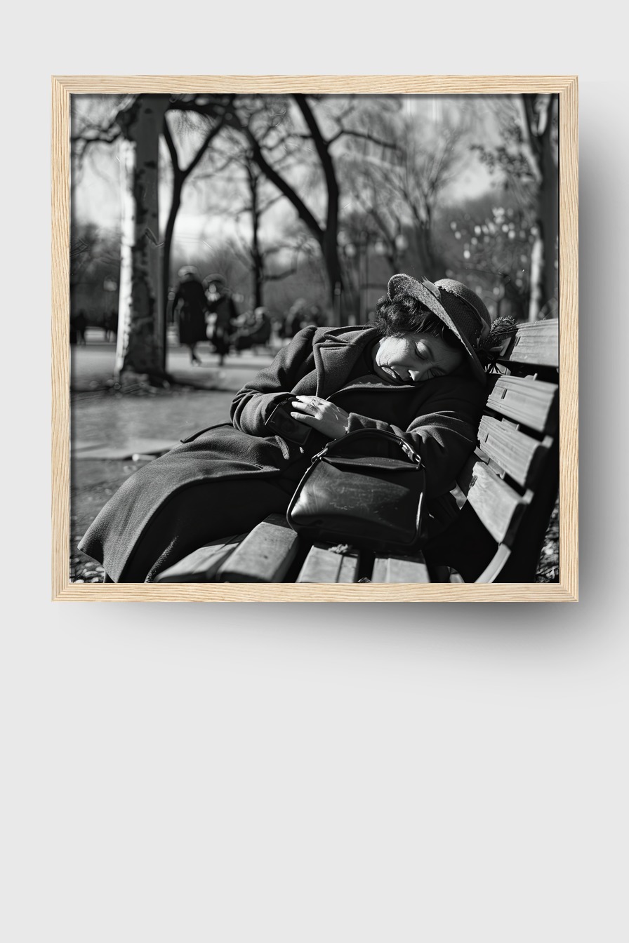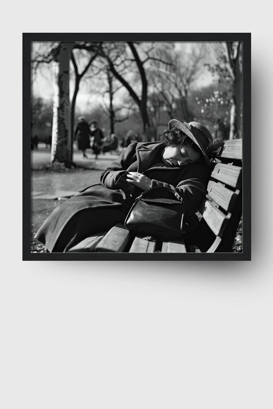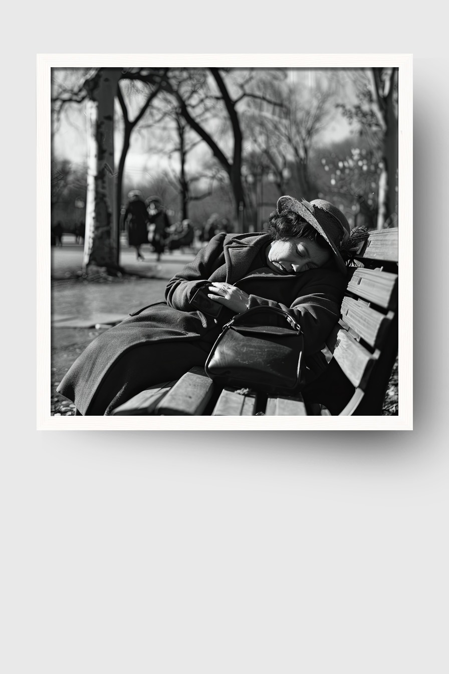 Dieser Moment eines unerwarteten Schlafs wirkt im Raum stark und still, die Umgebungsunschärfe hebt die Intimität hervor.