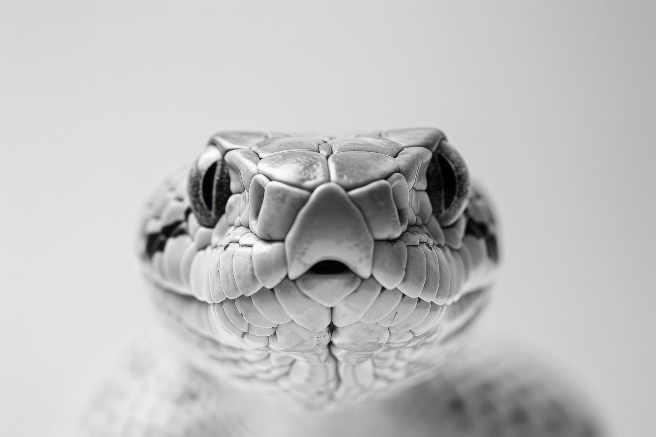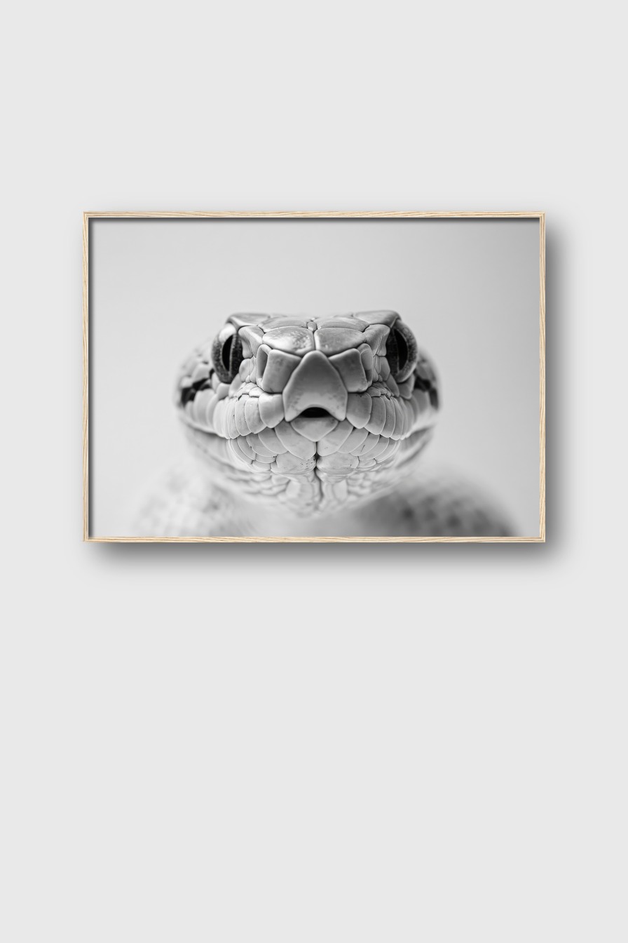Im Raum wirkt das Bild besonders präsent, da es den Blick direkt auf die detaillierten Konturen des Schlangenkopfes lenkt. Das Schwarz-Weiß setzt Kontraste, die die feinen Texturen und die lebendige Anatomie betonen und eine faszinierende Verbindung zum Betrachtenden schaffen.