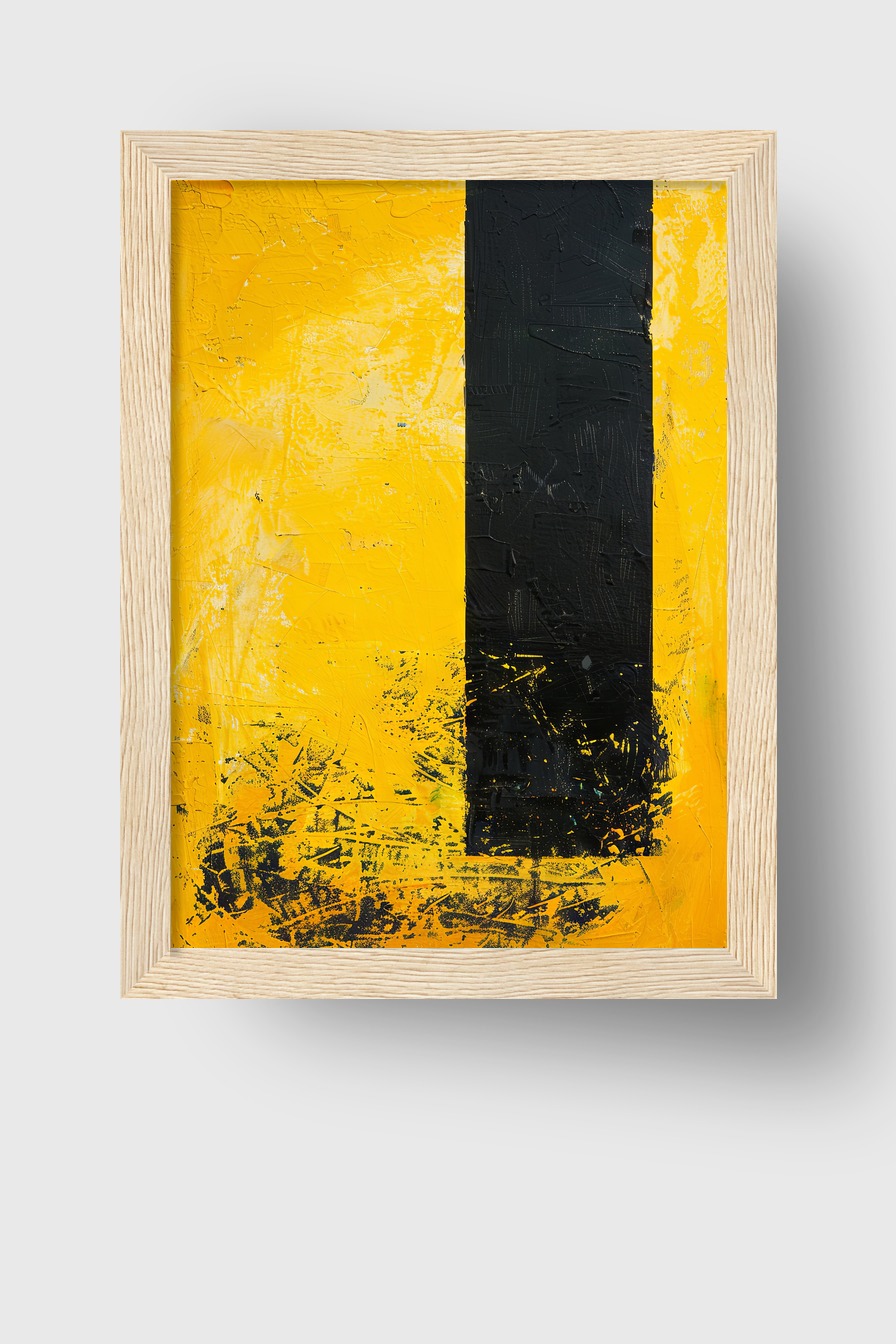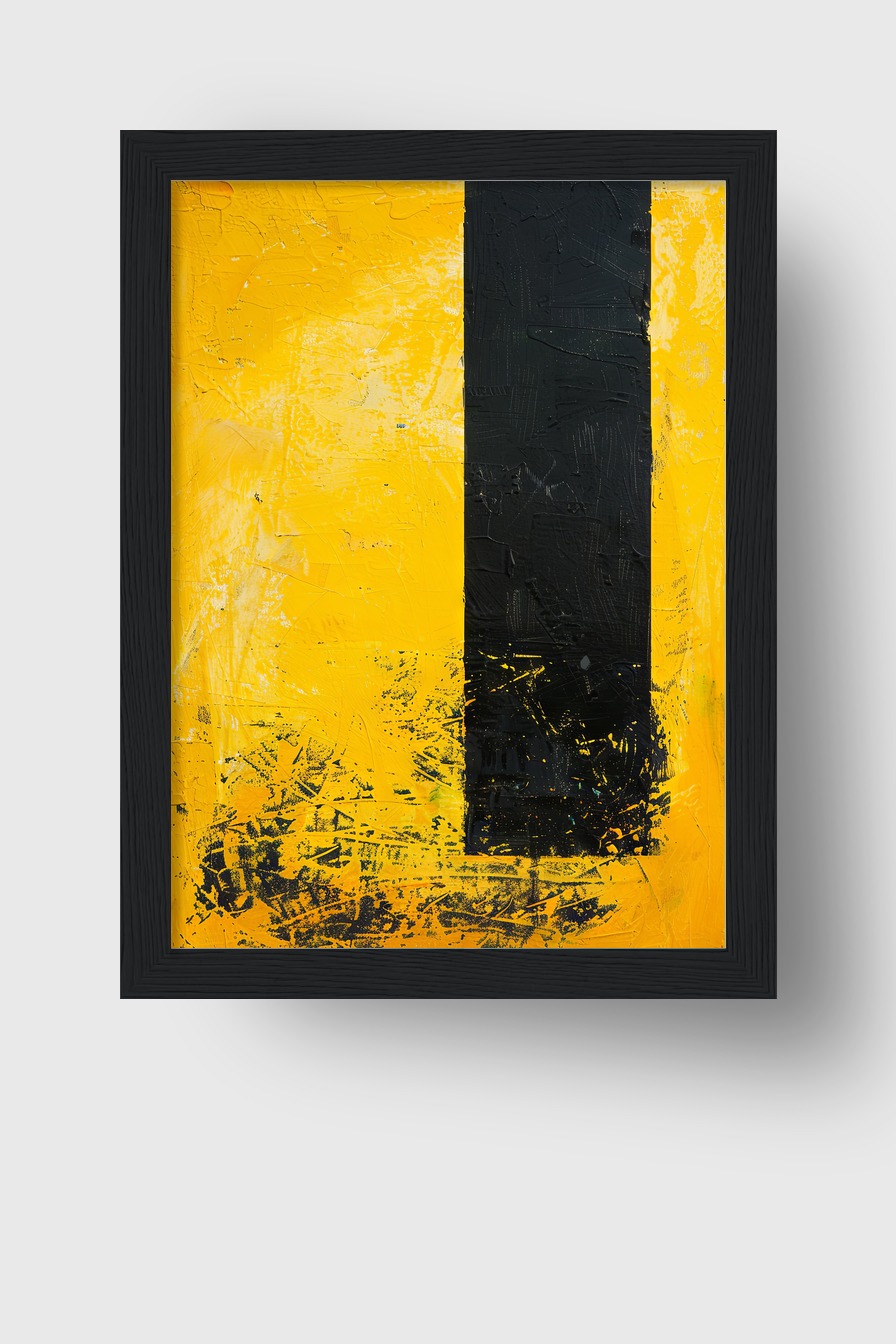 Schwarzer Streifen auf leuchtend gelbem Feld wirkt dominant und klar im Raum. Minimalistische Wirkung.