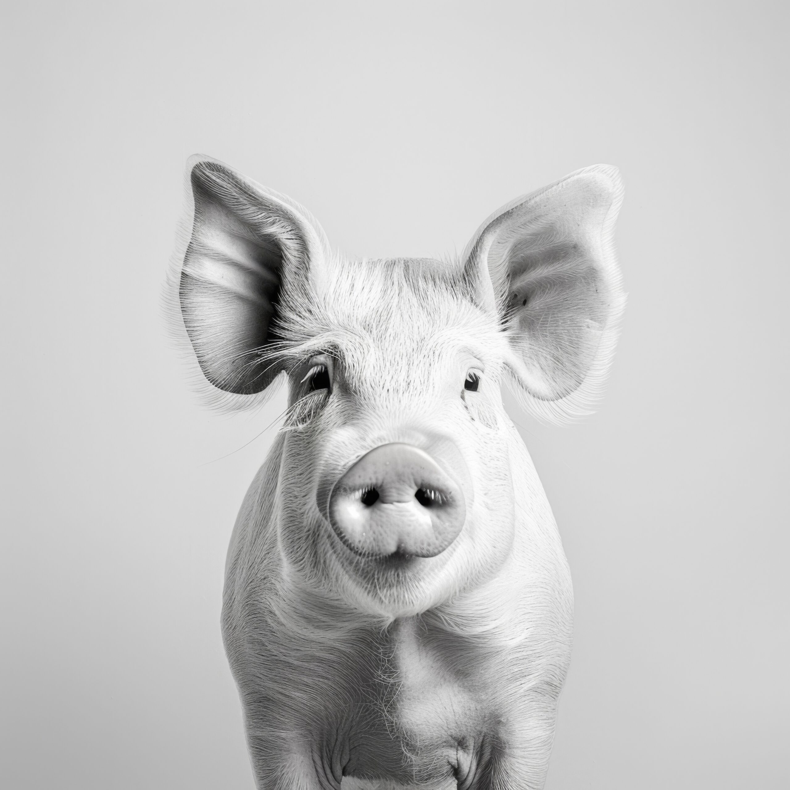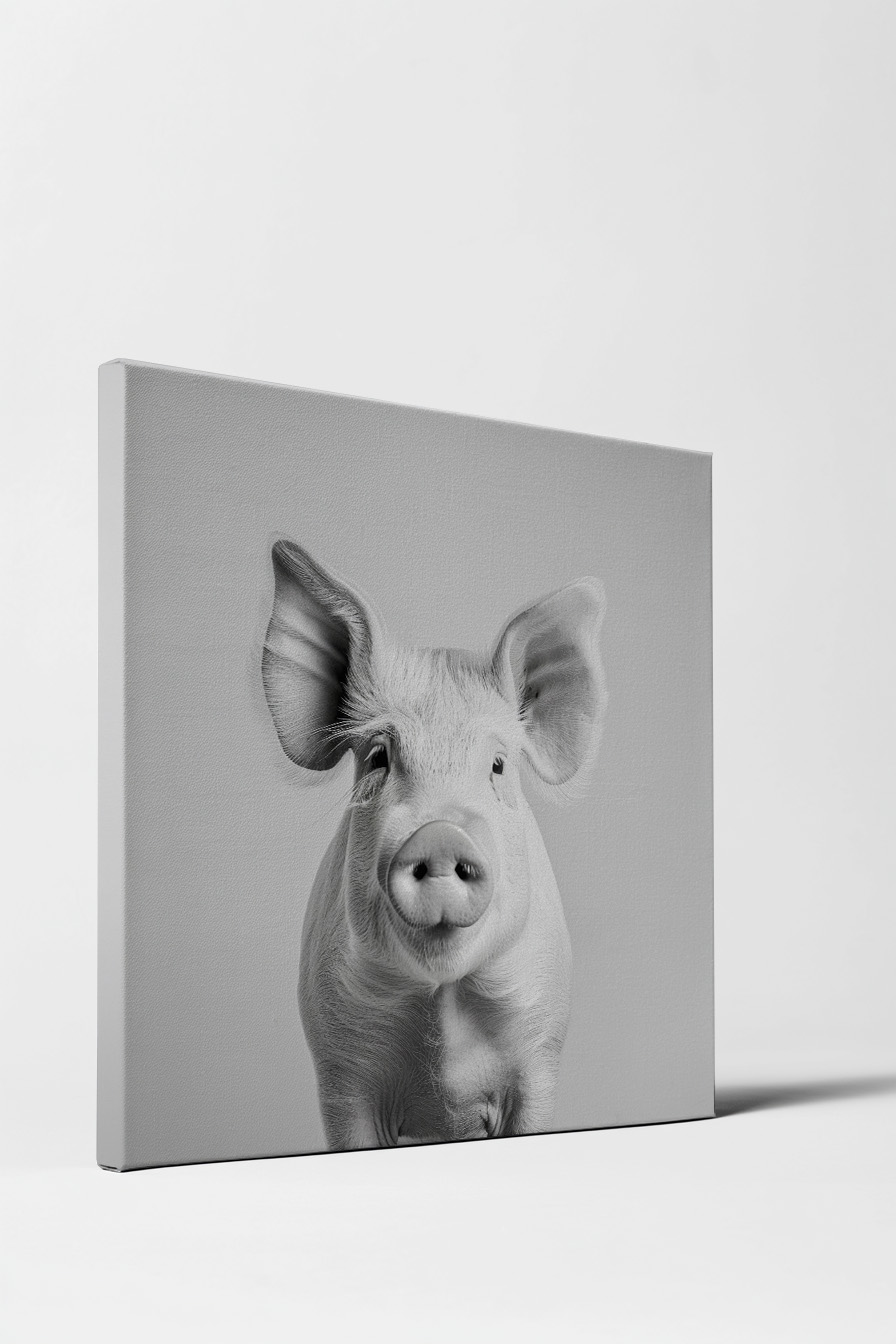 Das Bild wirkt durch die ruhige Komposition und die monochrome Farbgebung besonders eindringlich. Die Details im Fell und die weichen Schatten verstärken die natürliche Ausstrahlung des Schweins. Ein starker Fokus liegt auf der dezenten Struktur der Haut und der lebendigen Präsenz des Tiers.