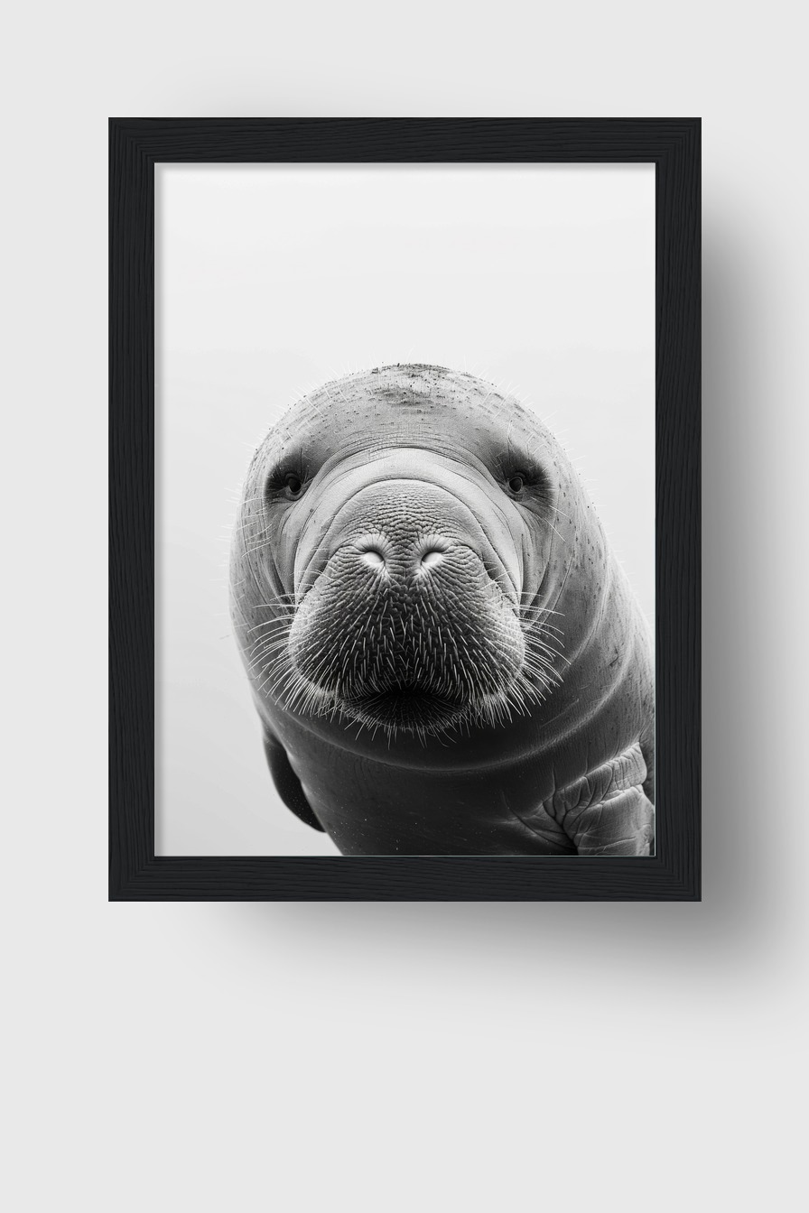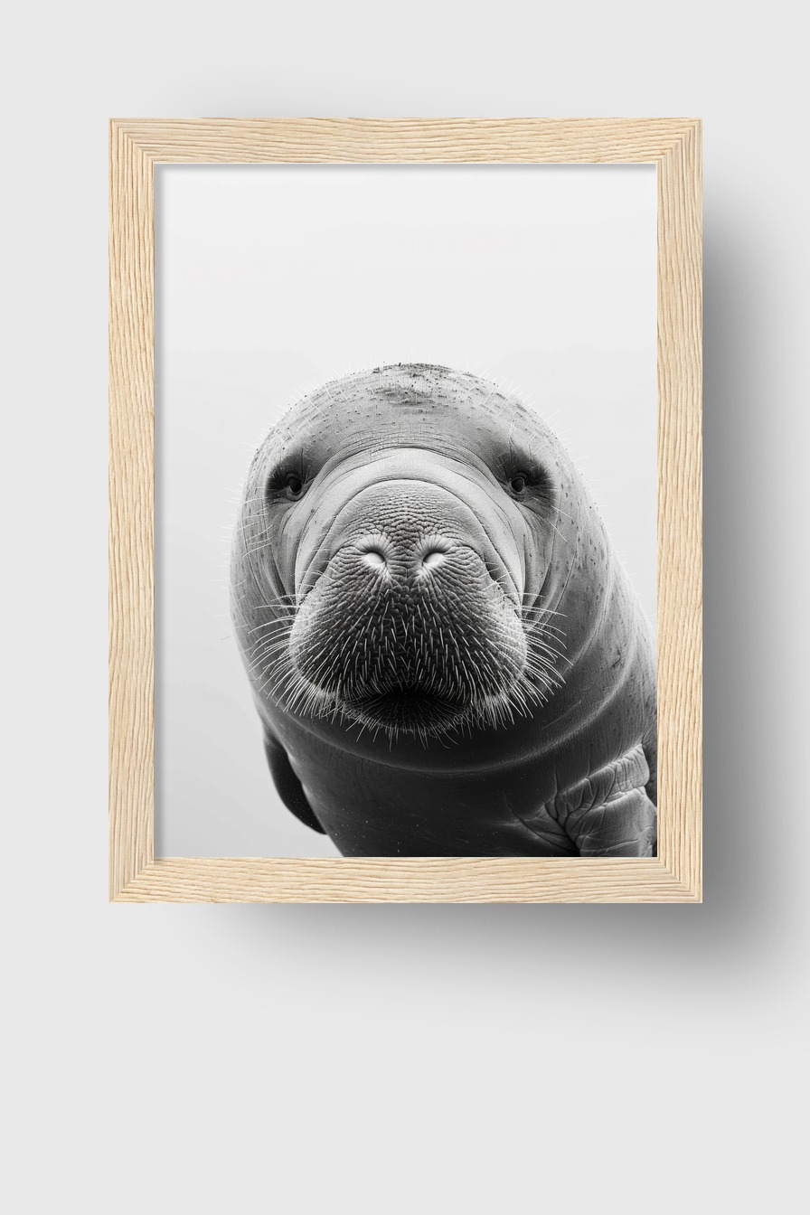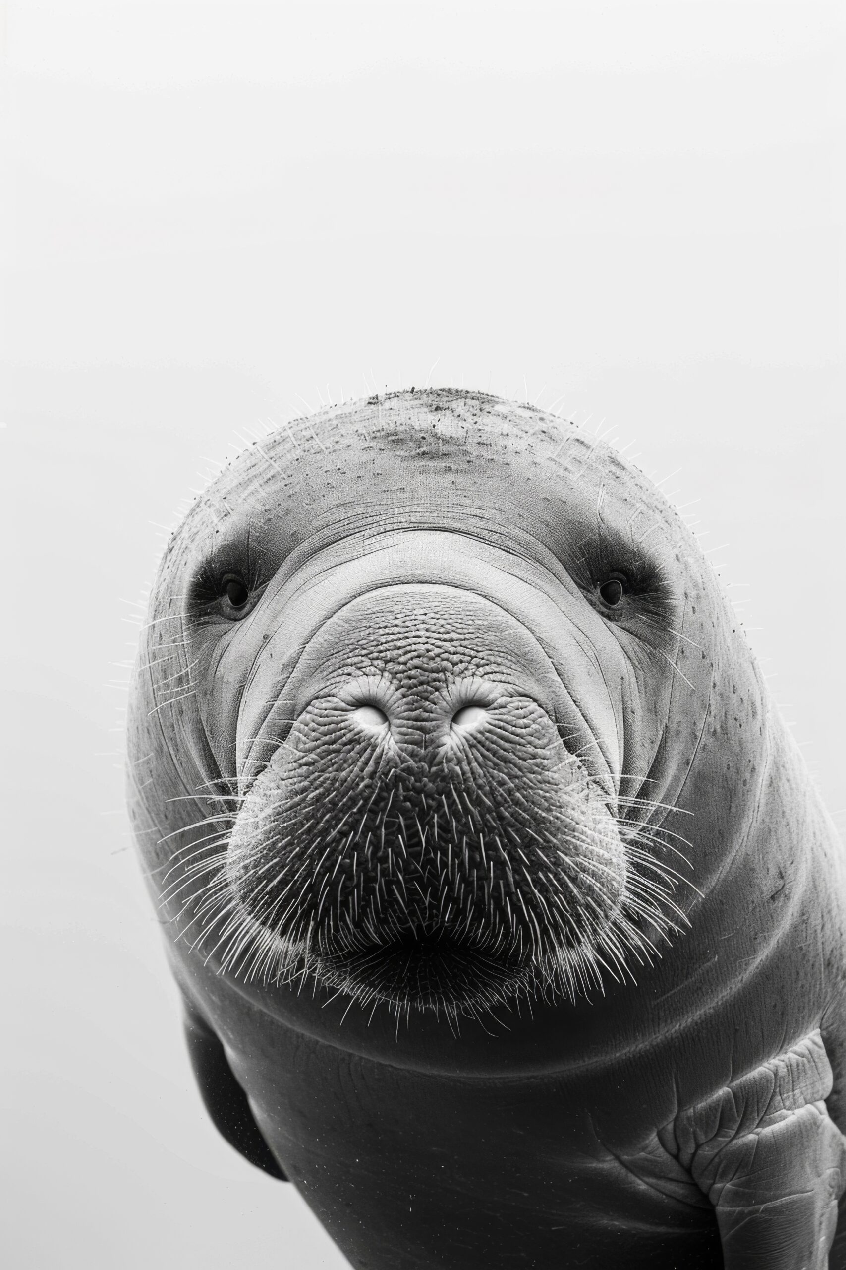 Im Raum lenkt die kontrastreiche Detailliertheit der Seekuhs Schnauze die Aufmerksamkeit auf das Motiv. Die schlichte Komposition schafft eine ruhige Atmosphäre mit Fokus auf Textur und Form. Der neutrale Hintergrund unterstützt die Wirkung.