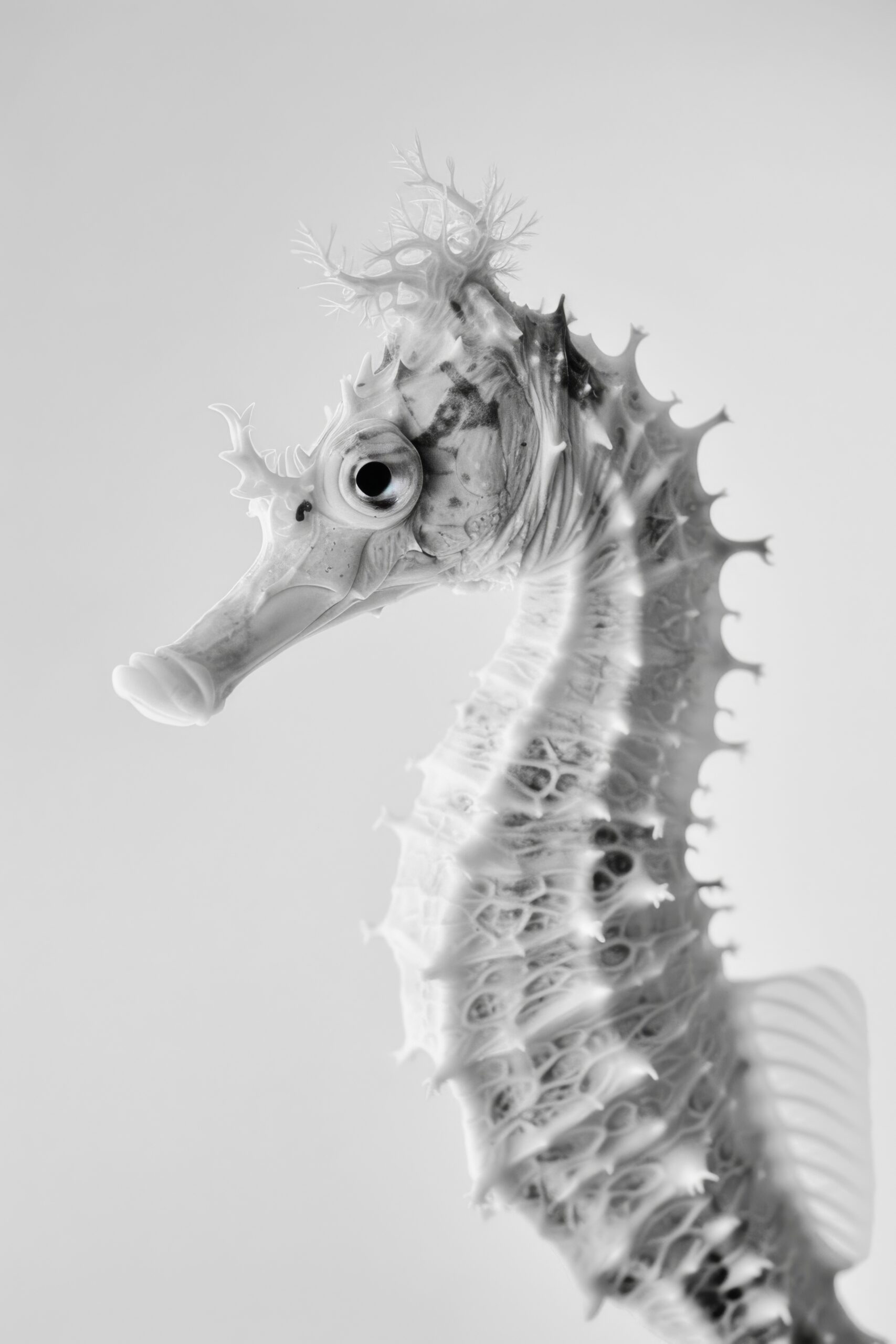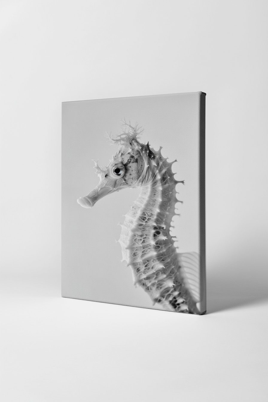Das Motiv zeigt das komplexe Skelett und die feine Struktur des Seepferdchens in einem hellen Schwarz-Weiß-Kontrast.