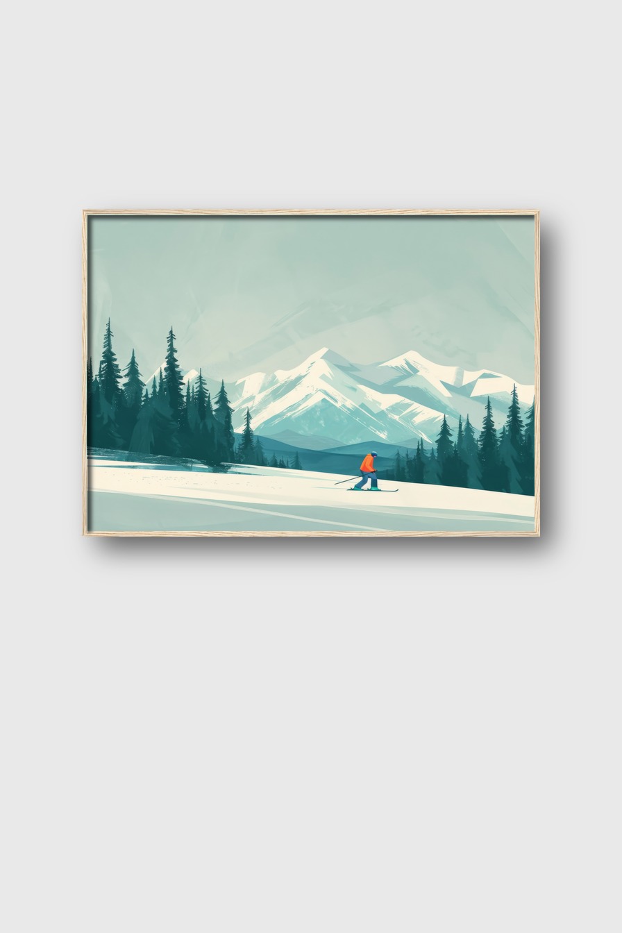 Im Raum entfaltet die Szene einen kühlen, klaren Charme und bringt eine frische Bergluft ins Ambiente. Der kleine Skifahrer vor den imposanten Gipfeln sorgt für einen fokussierten Blickfang in der Einrichtung.