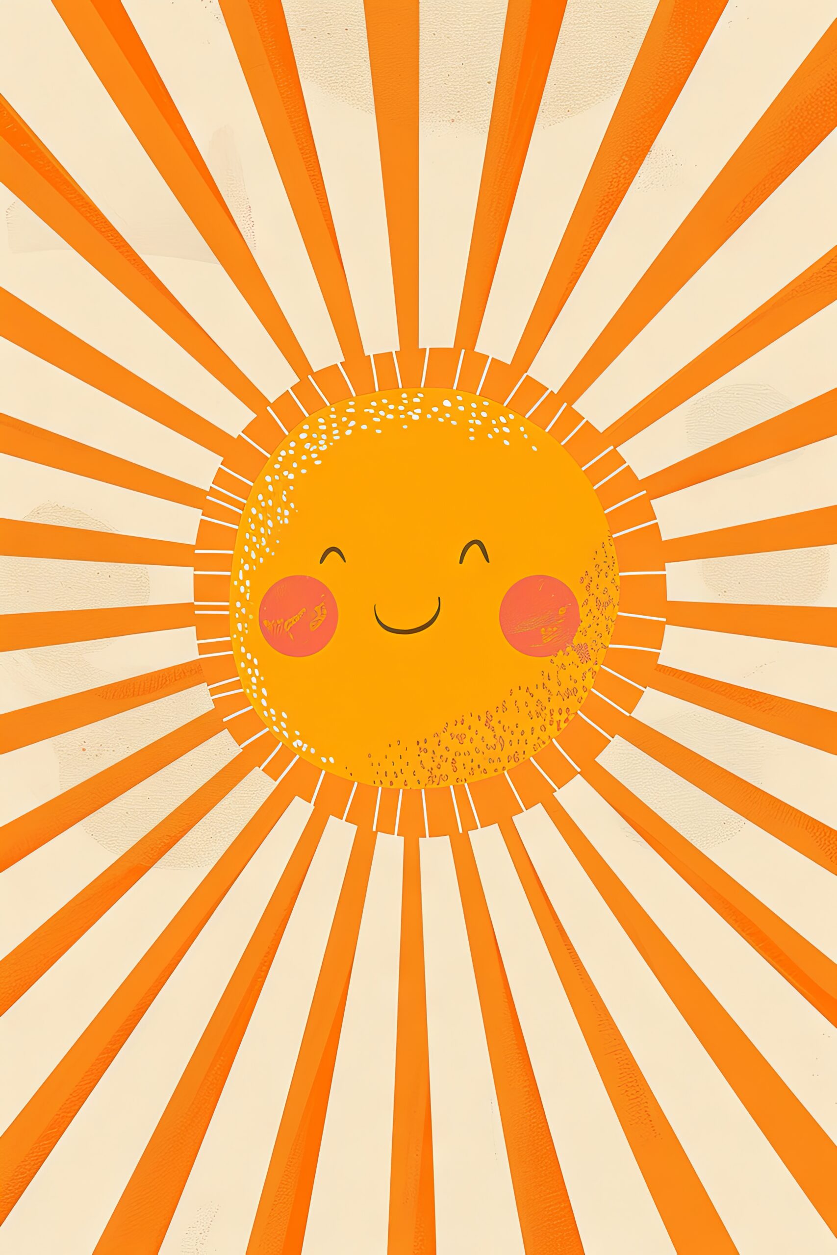 Die Sonne mit ihrem freundlichen Ausdruck wirkt fast greifbar, durch die großen Wangen in Rosa erhält sie einen charmanten Charakter. Die Strahlen fächern rhythmisch von der Mitte aus, strukturieren das Bild und verleihen ihm Dynamik und Wärme.