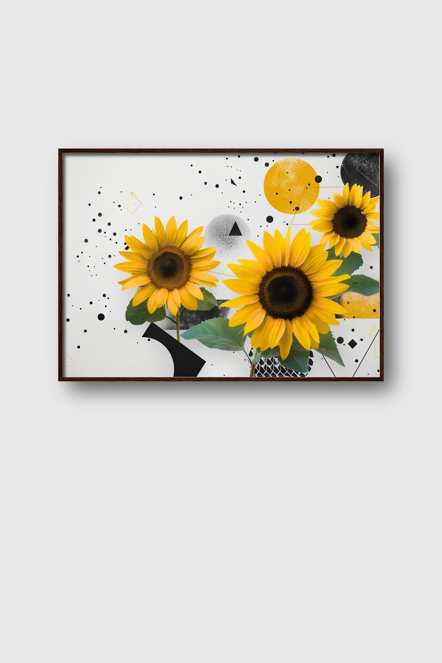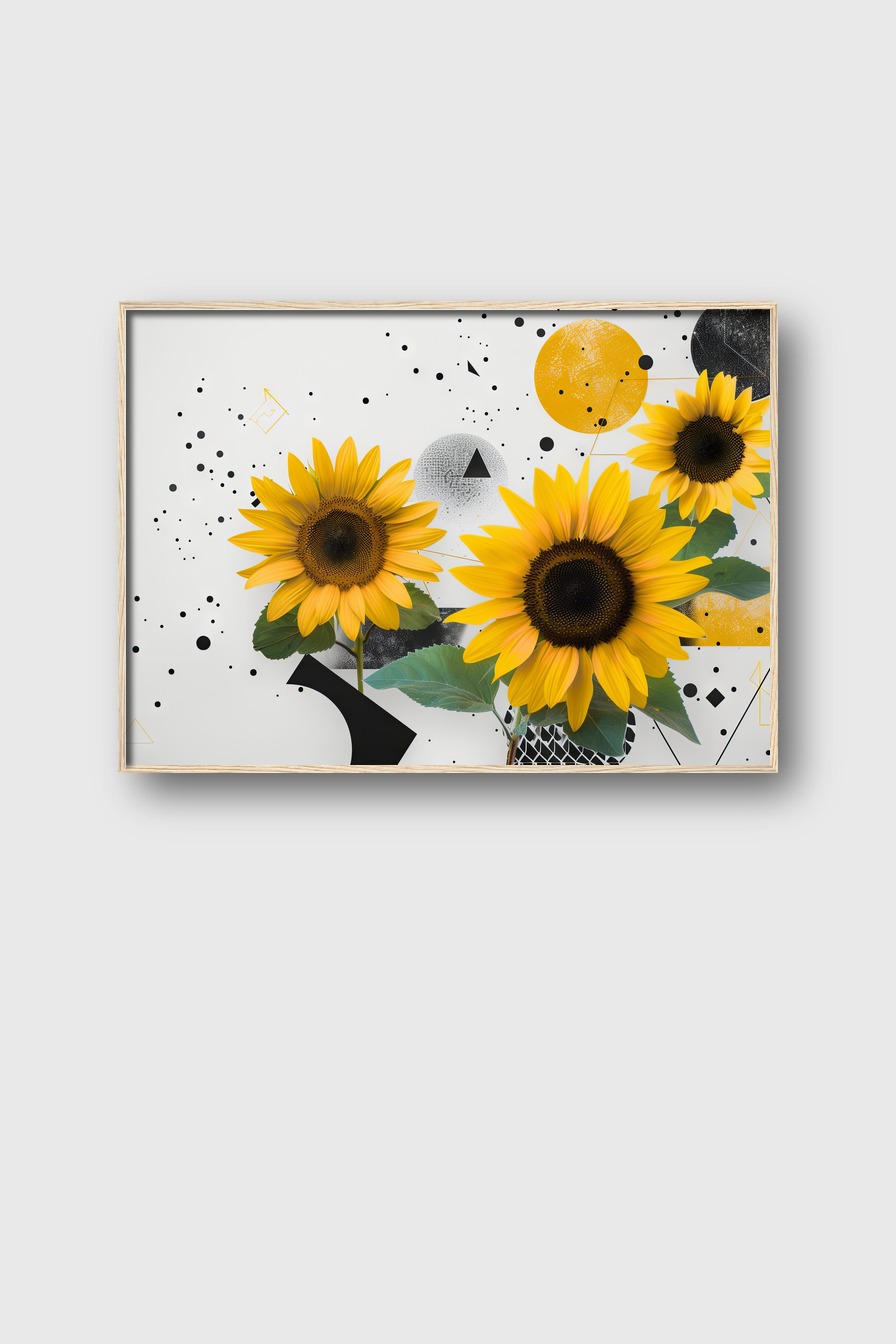 Poster mit Sonnenblumen vor geometrischem Hintergrund auf 170 g/m² halbmattem Papier. Hinter bruchsicherem Plexiglas in einem FSC-zertifizierten Kiefernholzrahmen. Erhältlich in Schwarz, Weiß, Naturholz oder Dunkelbraun. Fertig zum Aufhängen inklusive Aufhängeset.