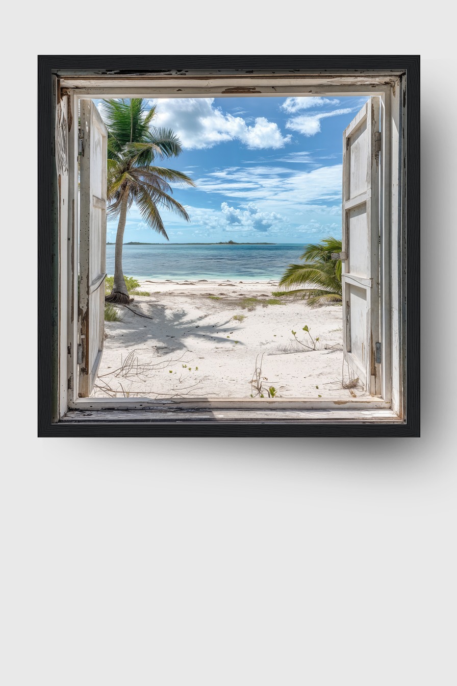 Das Motiv vermittelt durch das Fenster eine weite Sicht auf Strand und Meer und schafft Tiefe im Raum.