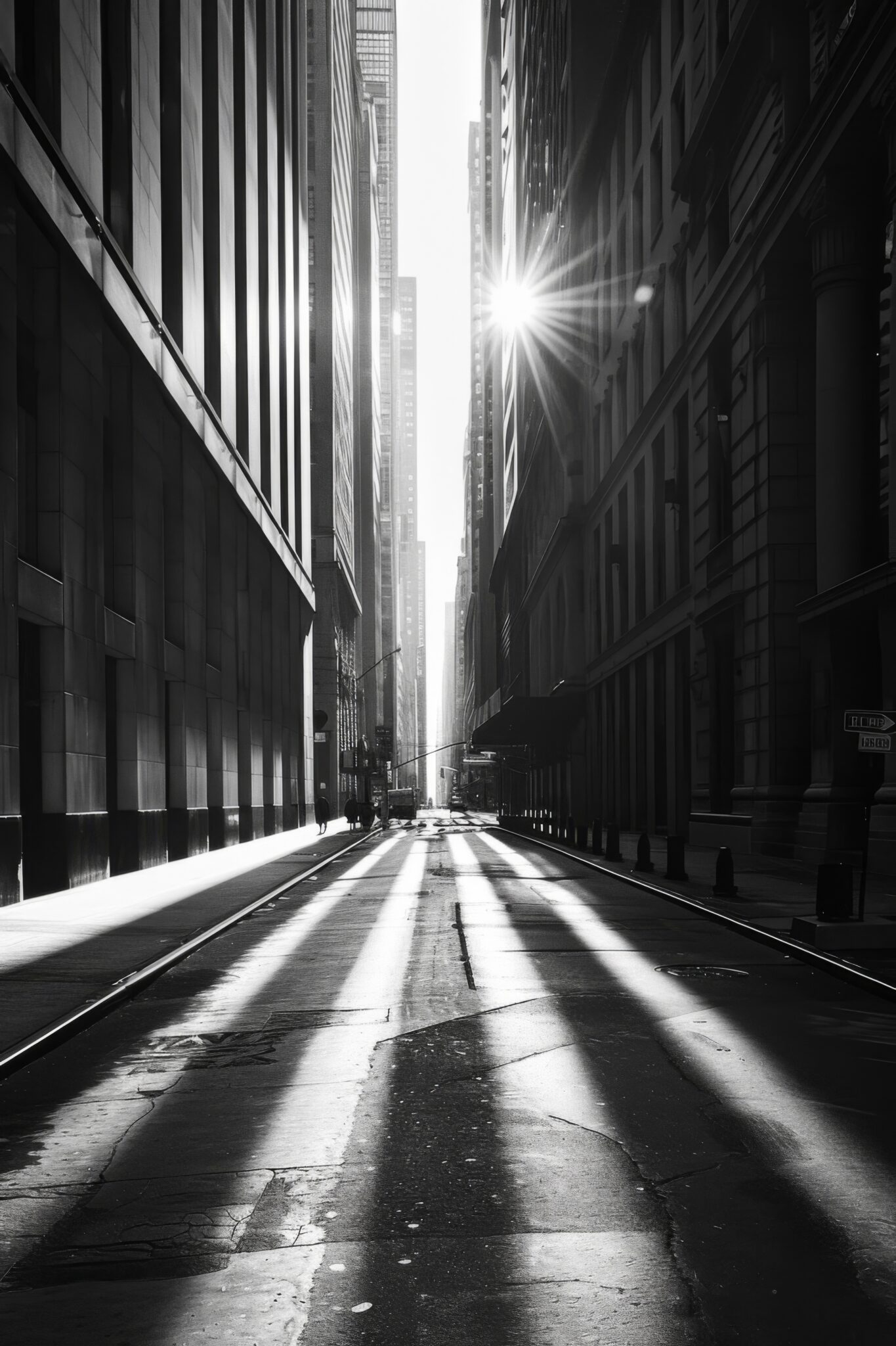 Lichtstrahlen schneiden scharf über den Asphalt und erzeugen starke Kontraste. Die verzerrten Schatten der Hochhäuser formen dynamische Linien, die den urbanen Raum prägen.