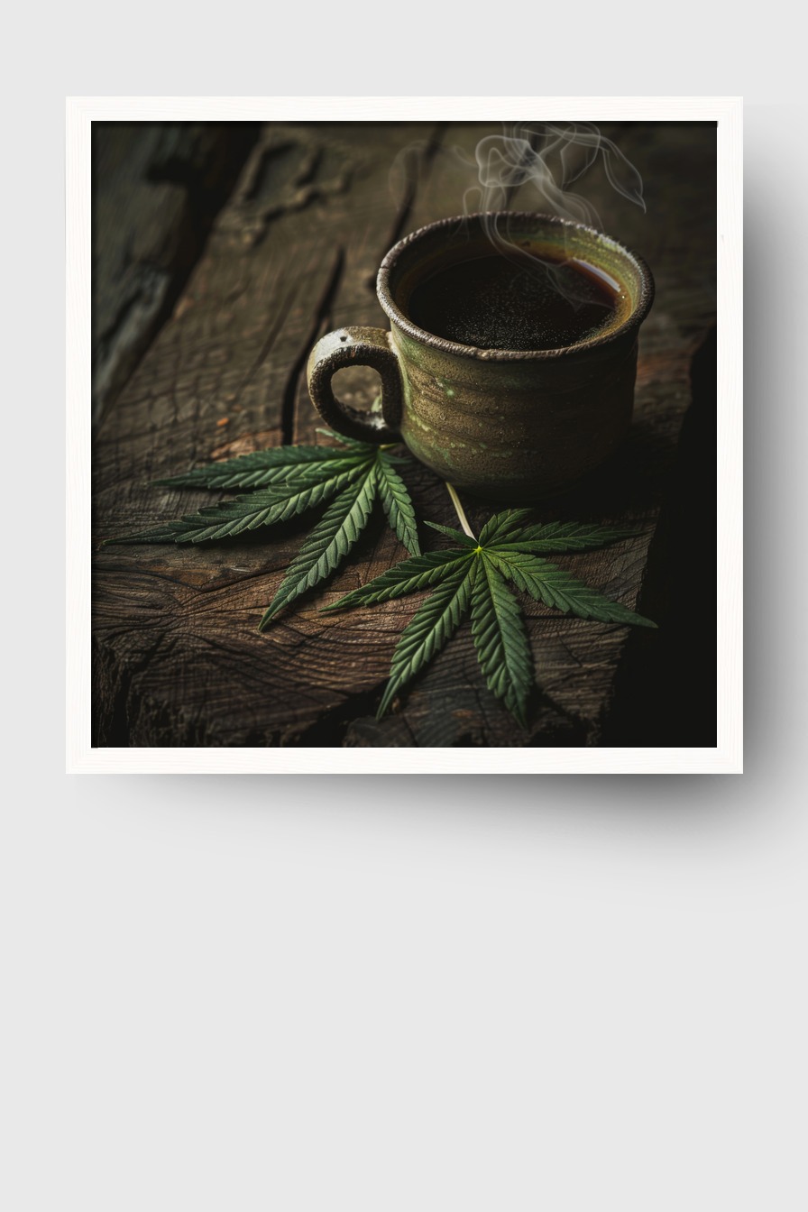 Dampfschwaden steigen aus der Tasse auf, die auf einer rustikalen Holztischplatte mit zwei Hanfblättern liegt.