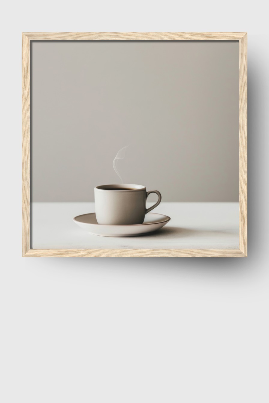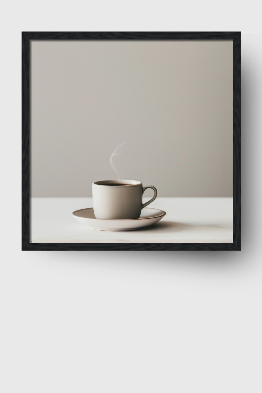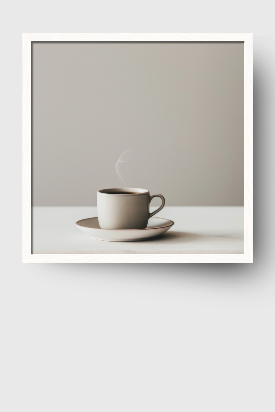 die klare Form der Tasse und der Dampf setzen einen schlichten Akzent im Raum