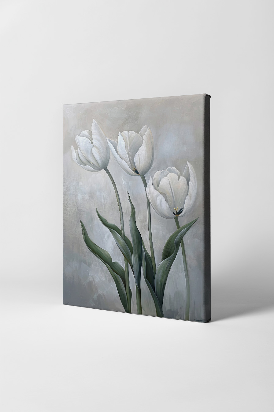 Die schlichten weißen Tulpen entfalten eine stille Kraft und wirken wie eingefangen in einem ruhigen Moment voller Eleganz und Reduktion.