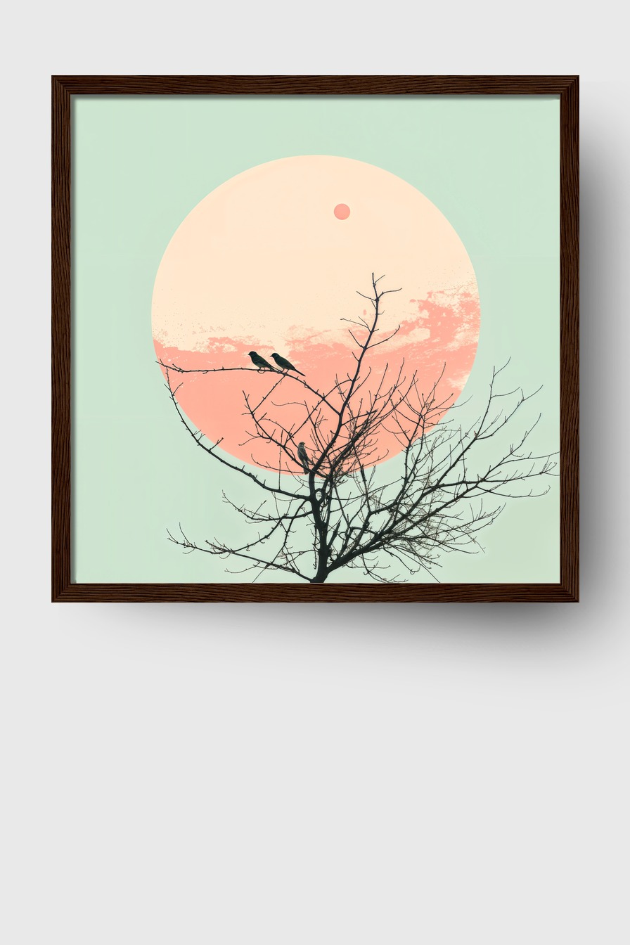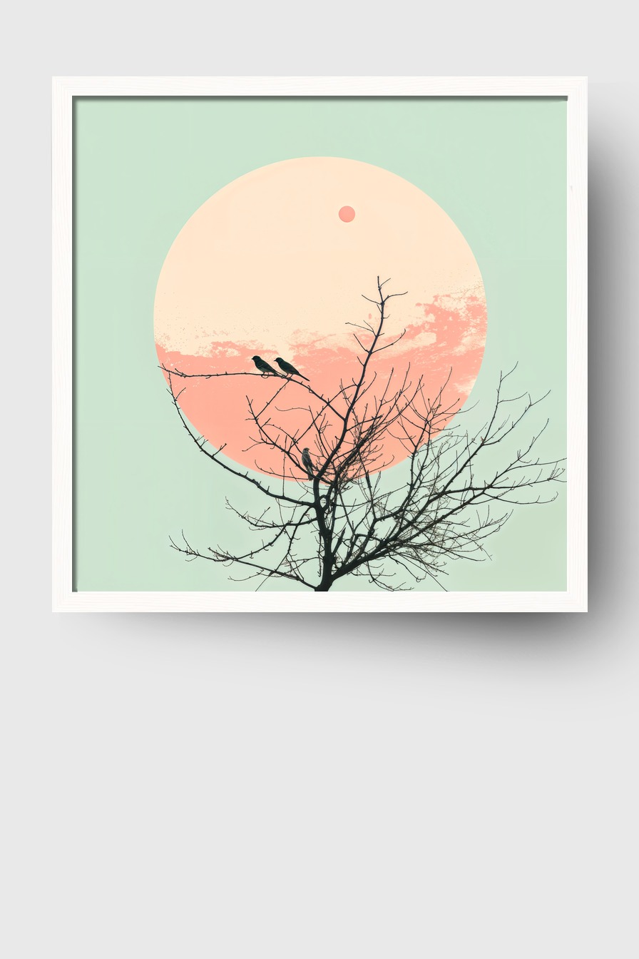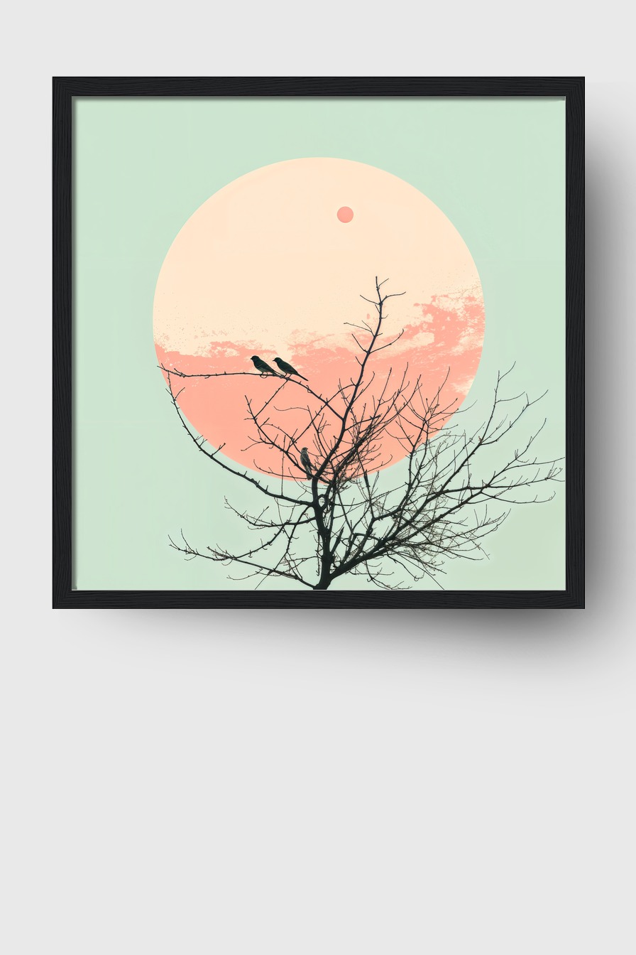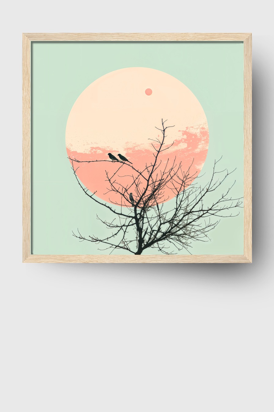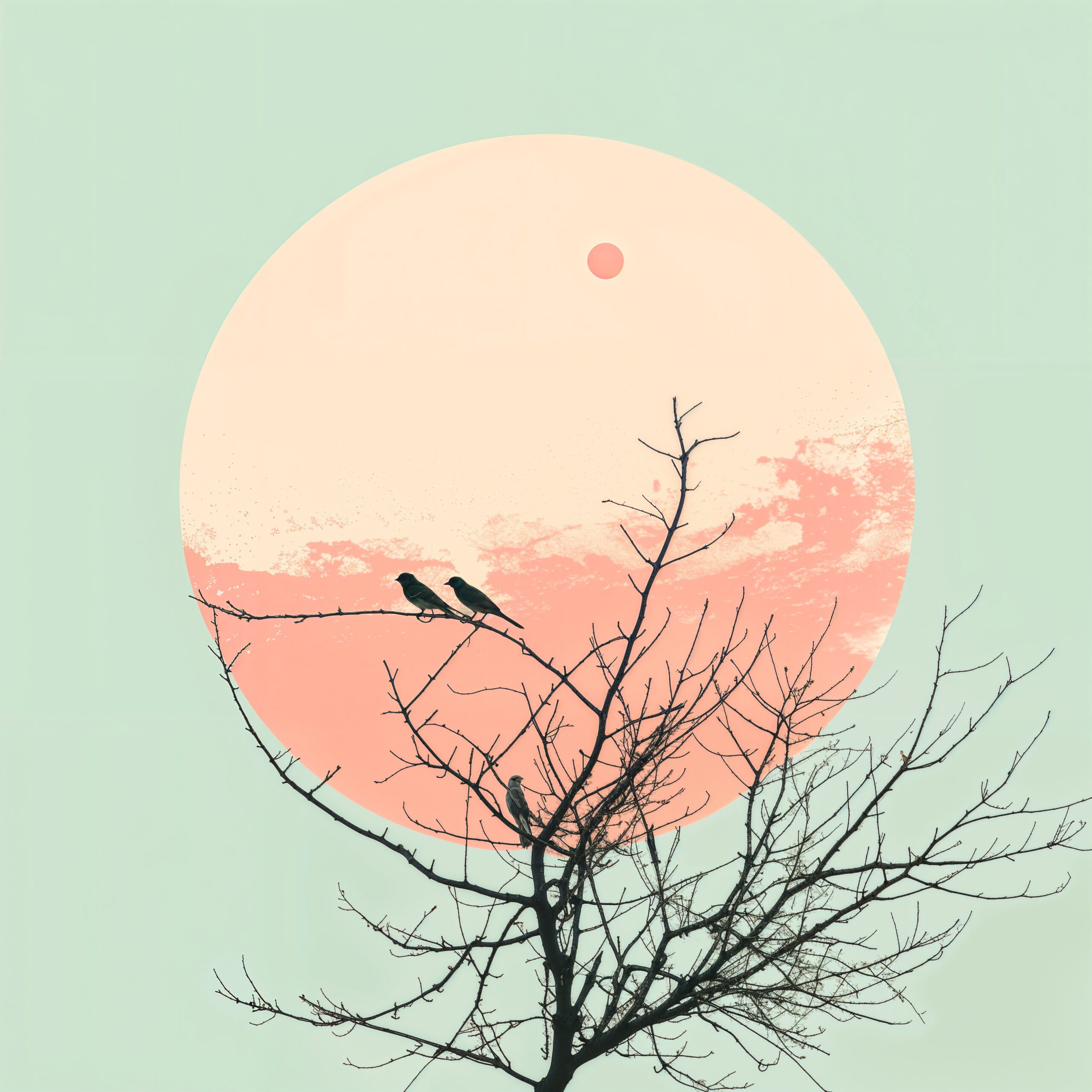 die minimalistische Komposition strahlt Gelassenheit aus, schlichte Formen und das Gewicht der Sonne vermitteln Tiefe, die Vögel als ruhige Figuren verleihen dem Raum eine subtile natürliche Präsenz