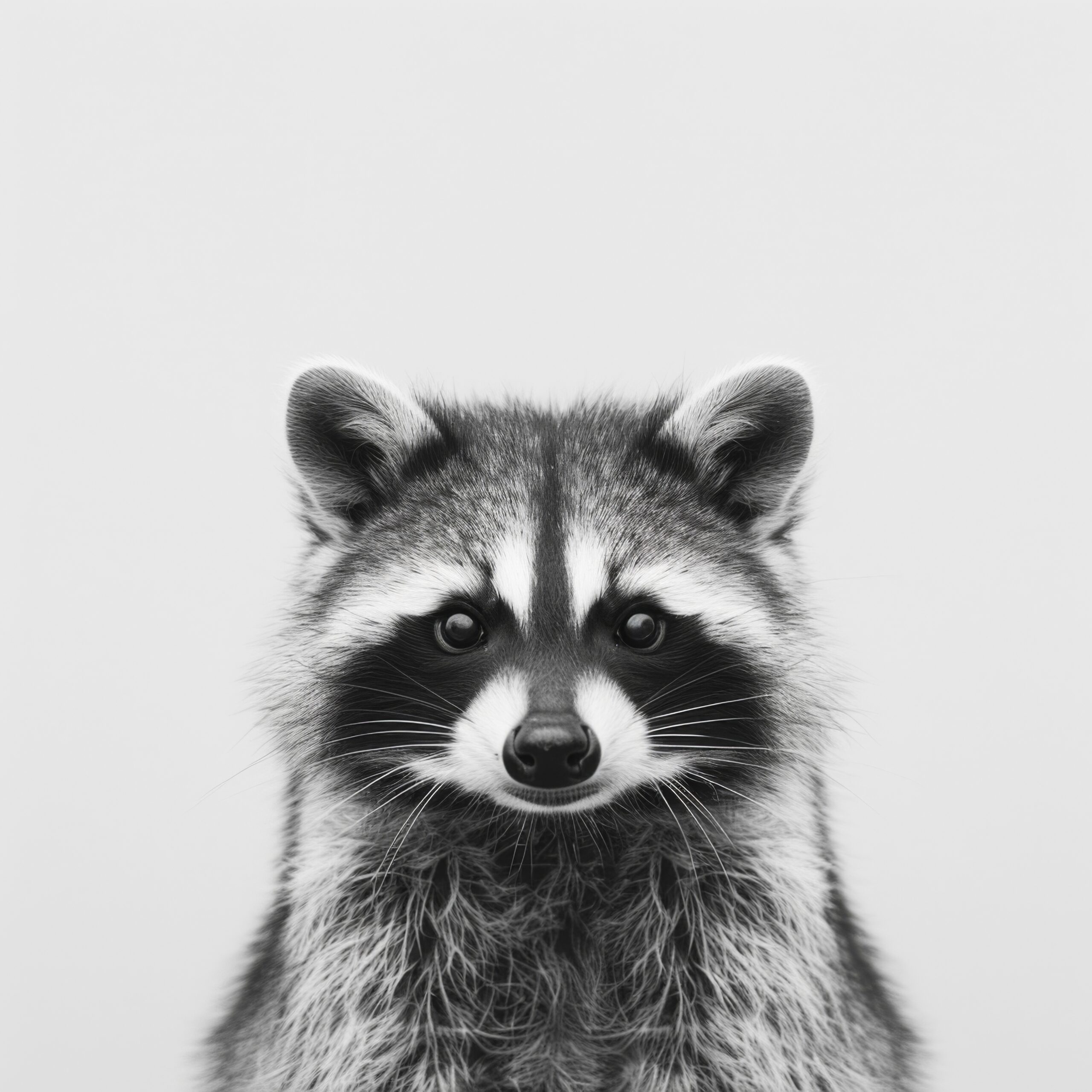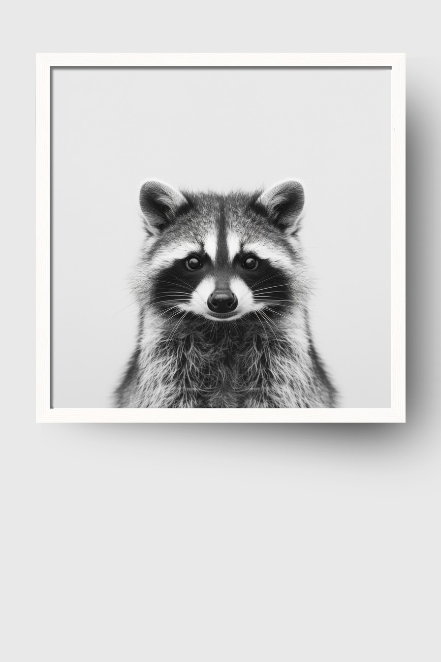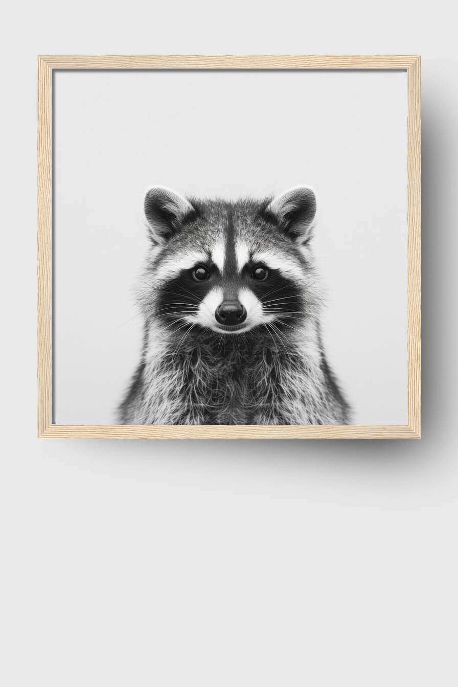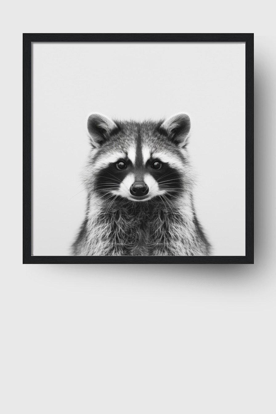 Der Waschbär wirkt nahbar und klar erkennbar im Raum. Detailreiches Fell und Gesicht verleihen dem Motiv Präsenz.