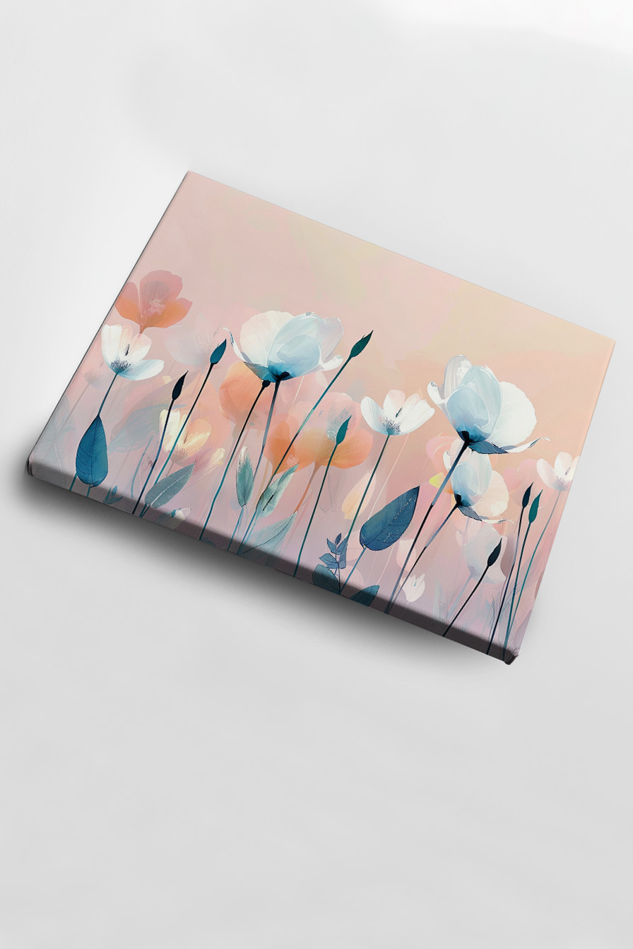 Durch das helle Leuchten der weißen Blüten entsteht eine ruhige Leichtigkeit. Der pastellige Orangeton im Hintergrund wirkt wie verschwommenes Licht, das die Pflanzen schweben lässt.