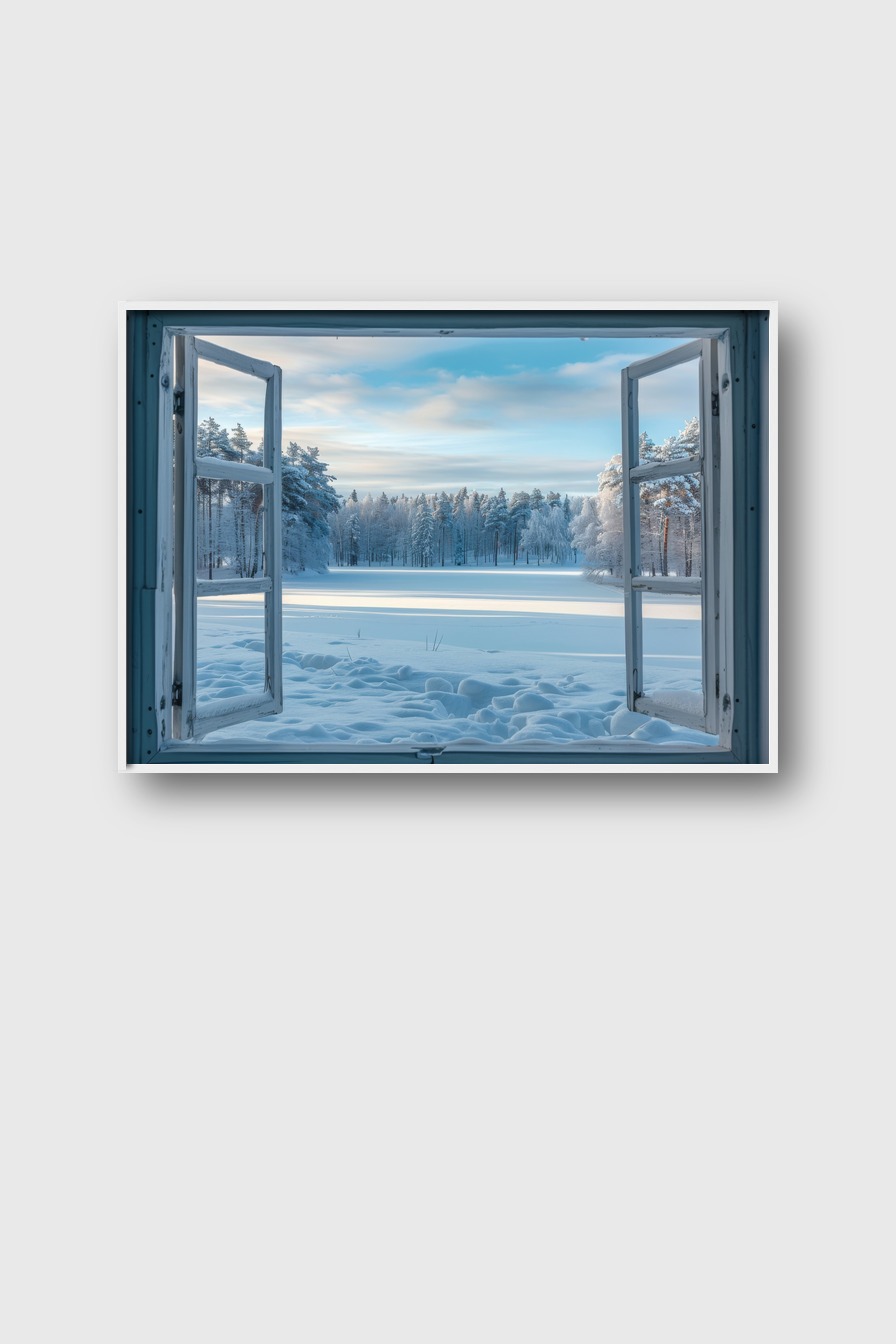 Das Motiv bringt die Stille und Kühle eines Wintertags in den Raum. Die offene Fensteransicht schafft Tiefe und lenkt den Blick nach draußen in die verschneite Natur.