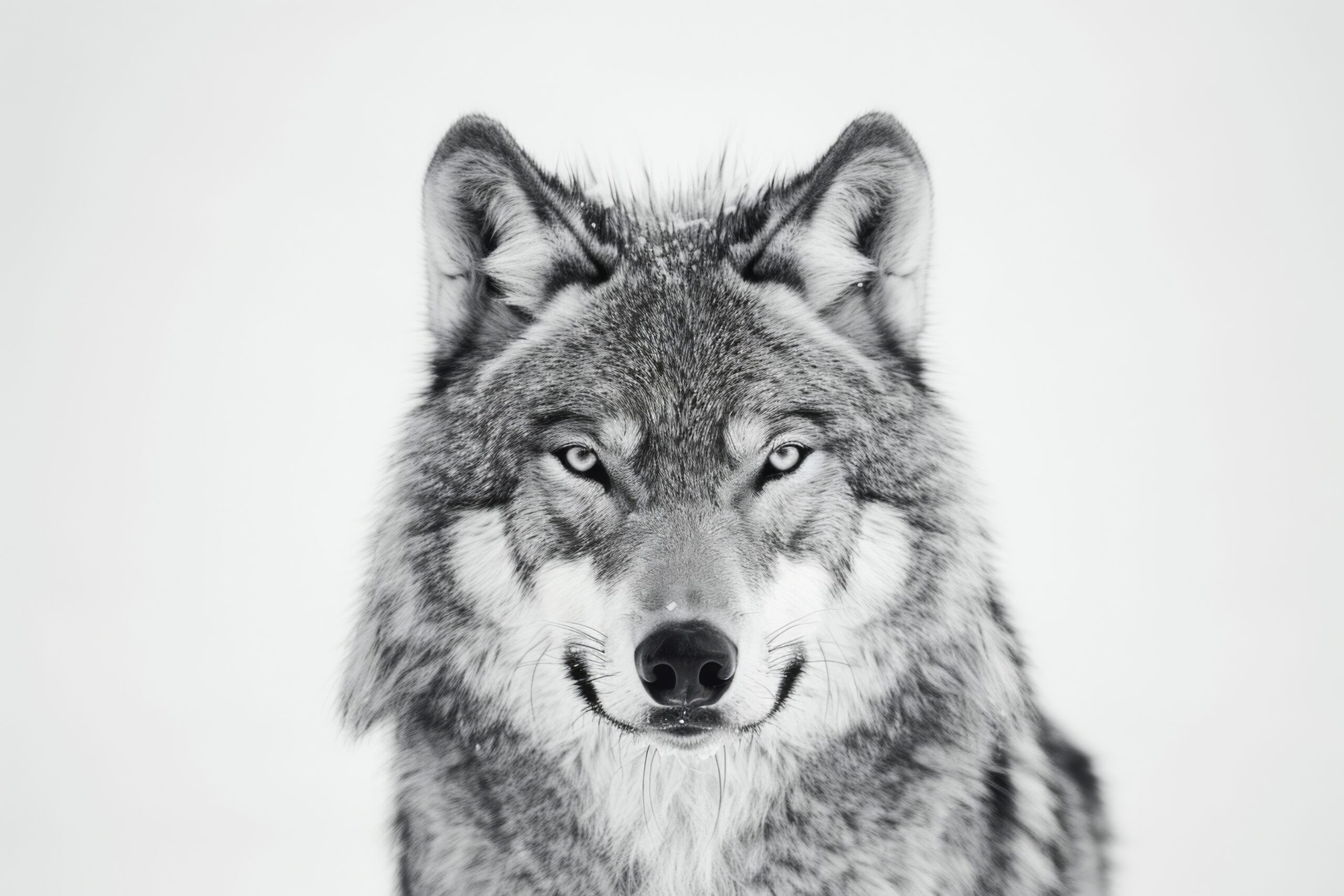 Der direkte Blick des Wolfs steht im Mittelpunkt des Bildes. Klare Konturen heben die Augen hervor.