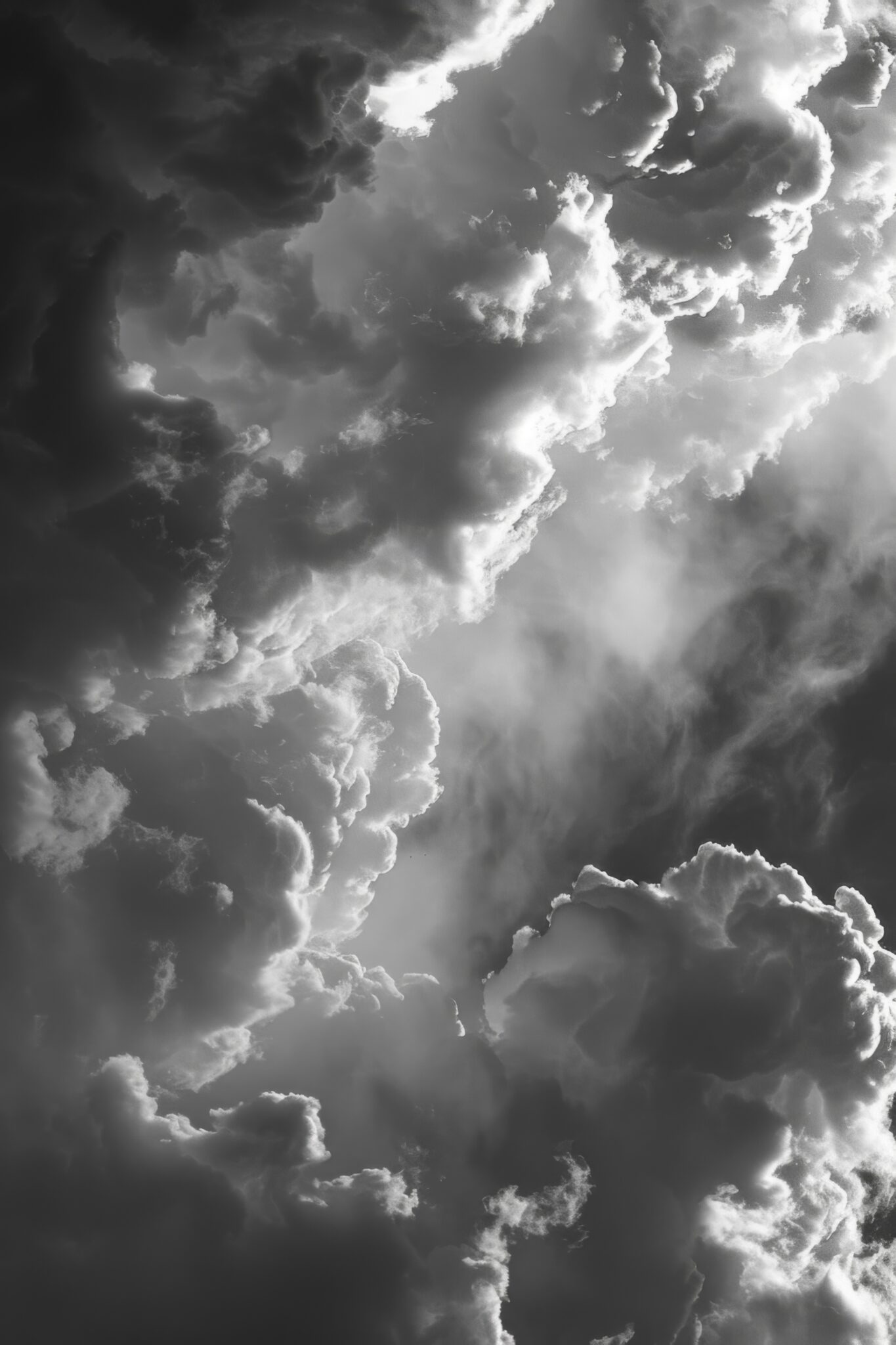 Detaillierte Wolkenformation mit starkem Hell-Dunkel-Kontrast. Wolkenwände und Lichtspiegelungen sichtbar.