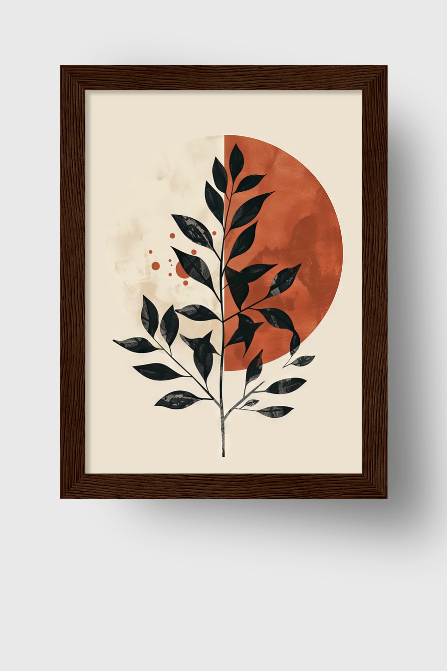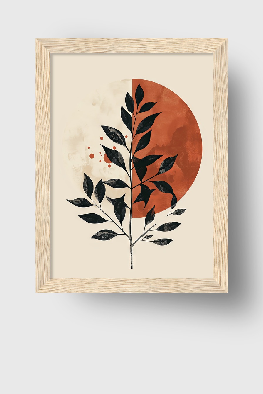 Der Zweig mit seinen strukturierten schwarzen Blättern steht vor einem roten Halbkreis. Das Motiv wirkt klar und dekorativ, passt gut in reduzierte Räume mit warmen Akzenten.