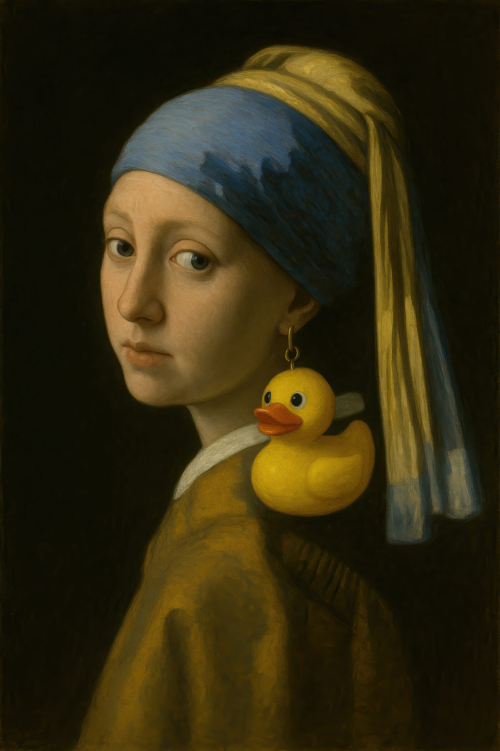 Rembrandts Bildwelt entsteht in einer Stadt, die gerade zum Handelszentrum Europas wird. Bürgerliche Auftraggeber, keine Fürsten – das verändert die Malerei grundlegend. Porträts werden ehrlicher, Gruppenbilder dramatischer, biblische Szenen bekommen die Schwere realer Menschen. Dieser Kontext schwingt in jedem Druck mit. Auch ungewöhnliche, fast augenzwinkernde Bezüge – etwa ein Motiv wie Mädchen Quietscheente, das klassische Porträttradition mit einem modernen Objekt konfrontiert – funktionieren nur, weil Rembrandts Formensprache so unverwechselbar ist. Wer tiefer in die Epoche einsteigen will, findet weitere Anknüpfungspunkte in der übergreifenden Sammlung Barock & Rokoko Poster mit klassischen Motiven.