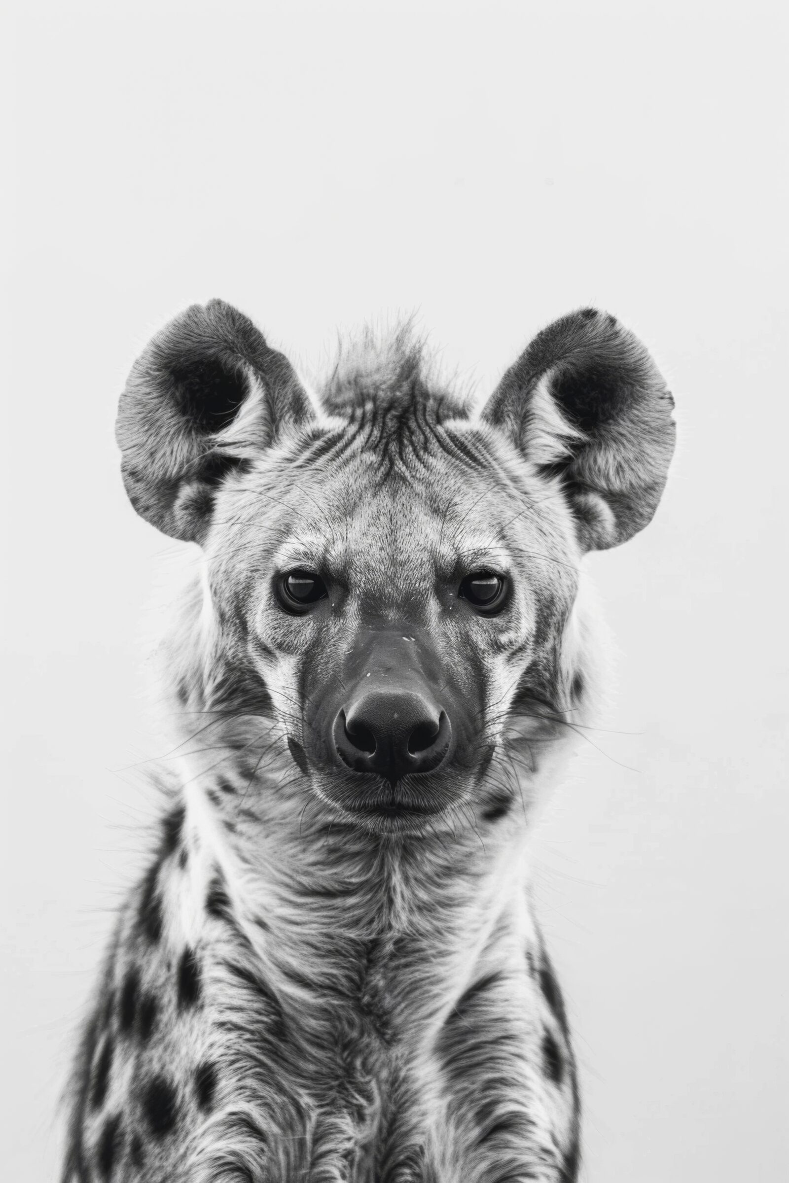 Die drei Hyänen-Arbeiten in dieser Kategorie verzichten bewusst auf Landschaftsbeiwerk. Kein Savannen-Sonnenuntergang, keine staubige Horizontlinie. Stattdessen stehen Kopf und Blick im Zentrum – eine Bildstrategie, die näher an moderner Tierfotografie als an klassischer Wildlife-Illustration liegt. Das macht die Motive kompatibel mit ruhigen, eher grafischen Einrichtungen. Wer diesen reduzierten Ansatz mag, findet verwandte Bildsprache in der Sammlung an Tierportrait Postern und in entsättigten Arbeiten der Kategorie Tiere in Schwarz-Weiß gerahmt.