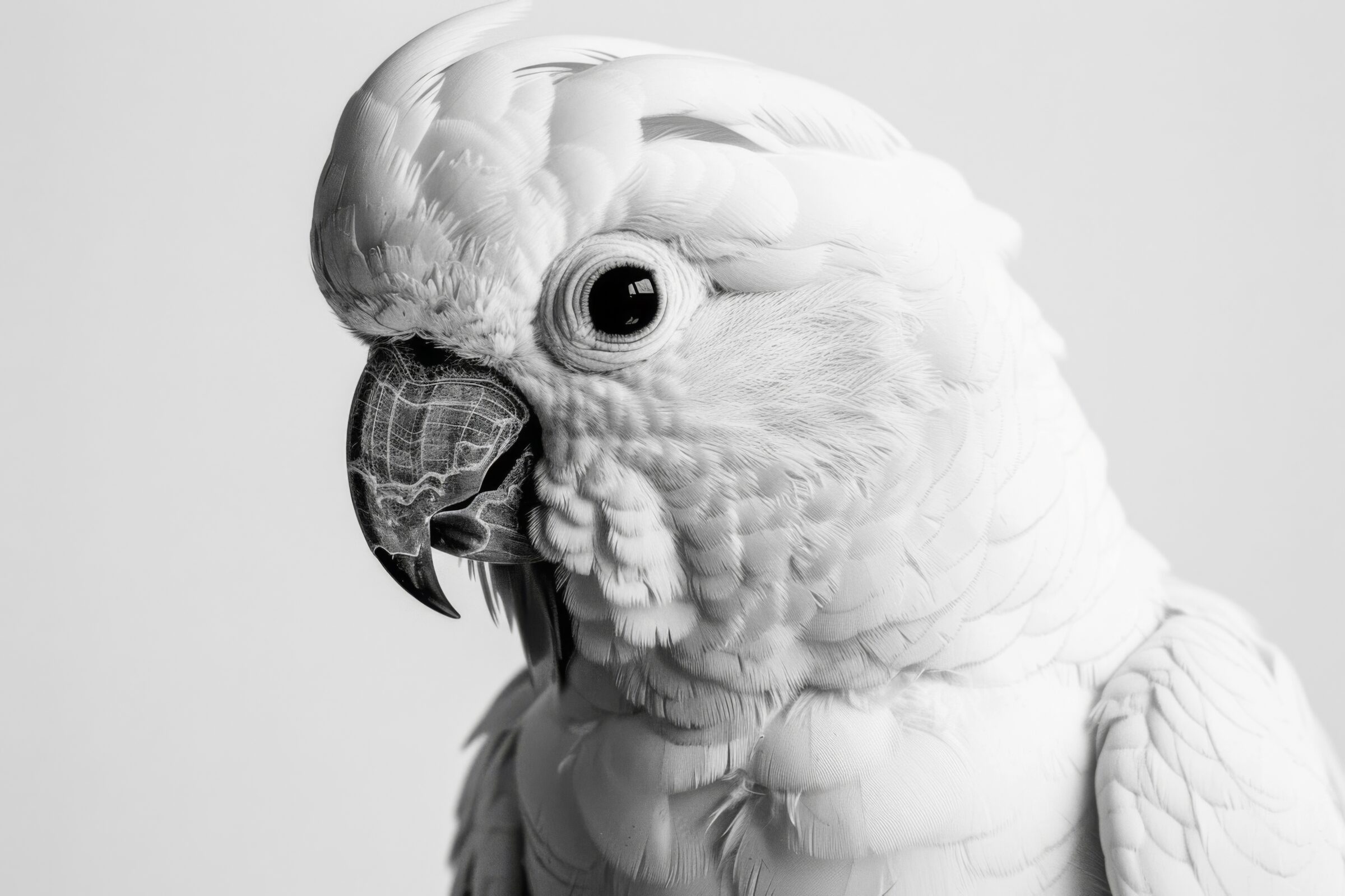 Der entscheidende Unterschied liegt in der Farbdramaturgie. Während Eulen- oder Entenporträts meist in gedämpften Brauntönen arbeiten, bringt der Papagei Gelb, Rot oder tiefes Schwarz-Weiß mit – letzteres vor allem beim Kakadu, dessen Gefieder ein eigenes grafisches Thema ist. Wer in diese Richtung weiterdenkt, findet im Bereich Tierporträts in Schwarz-Weiß einen ruhigeren Gegenpol. Die Kakadu-Motive dieser Kategorie leben von genau dieser Spannung: weißes Federkleid, gelbe Haube, sonst nichts.